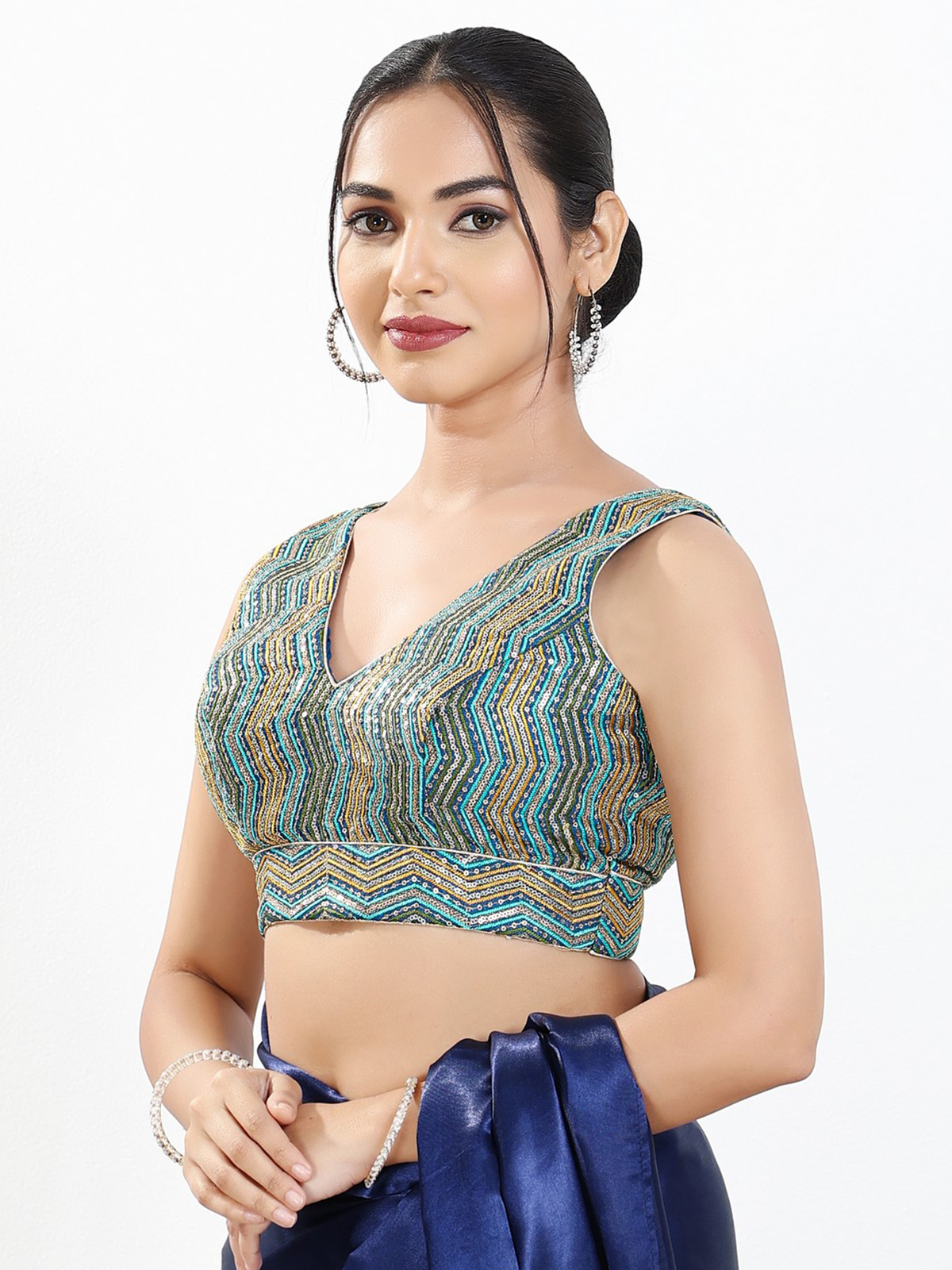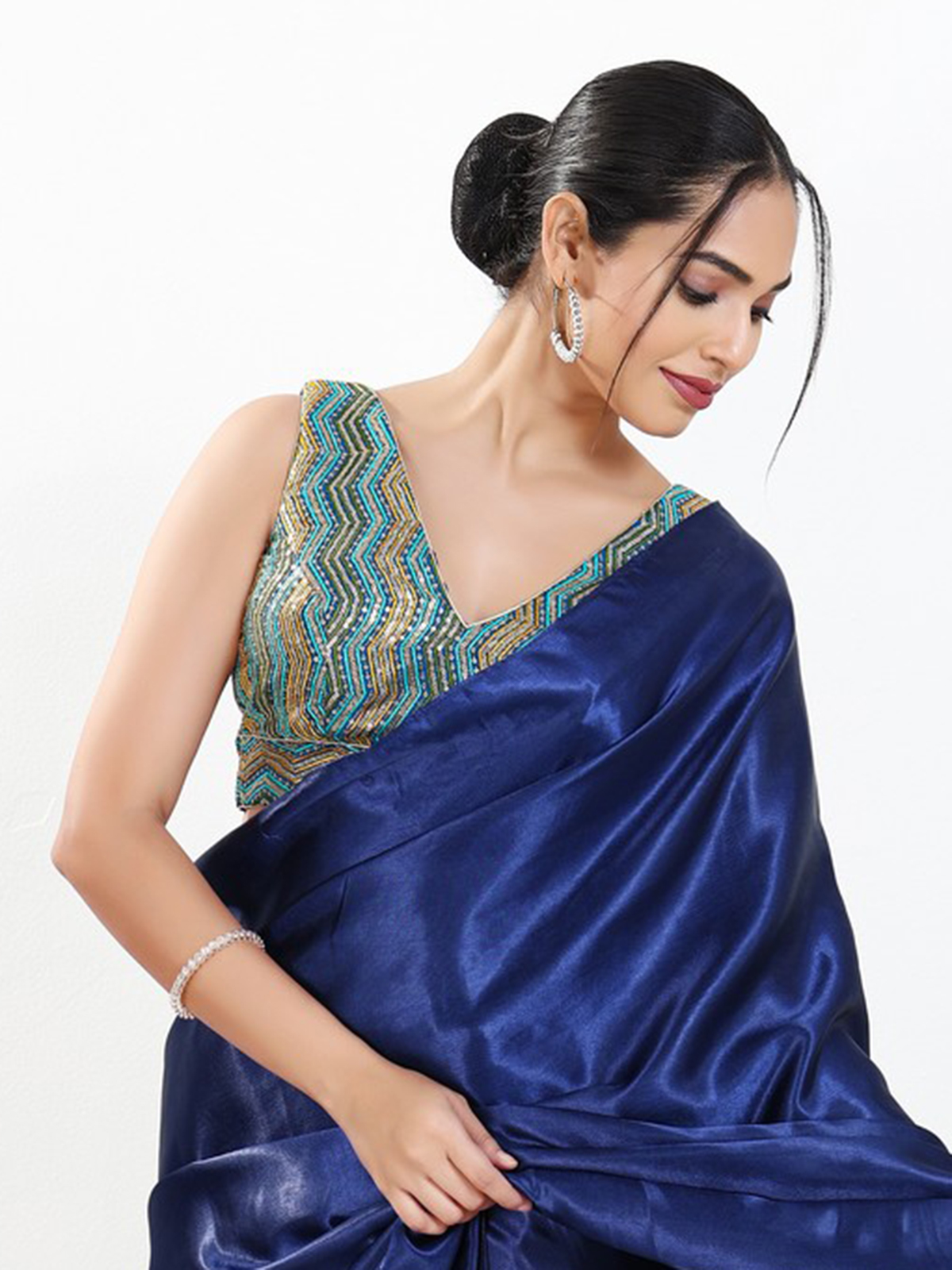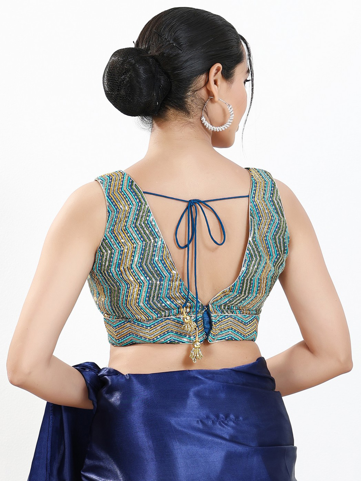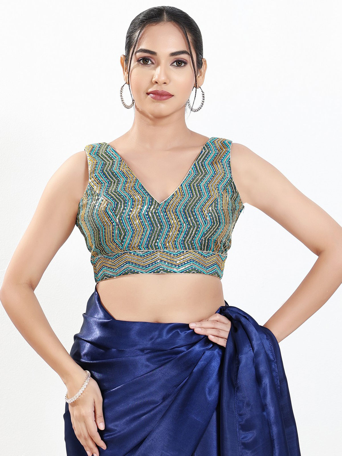 Blue Silk V Neck Sleeveless Ready Made Blouse