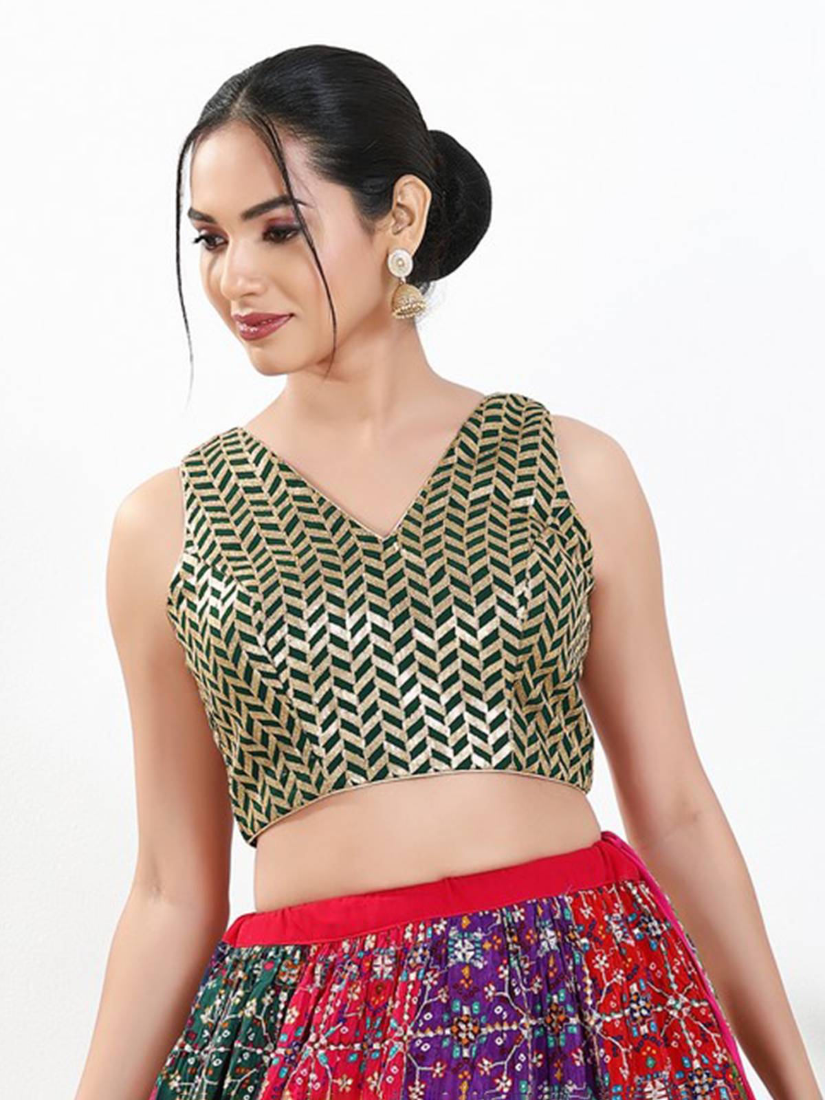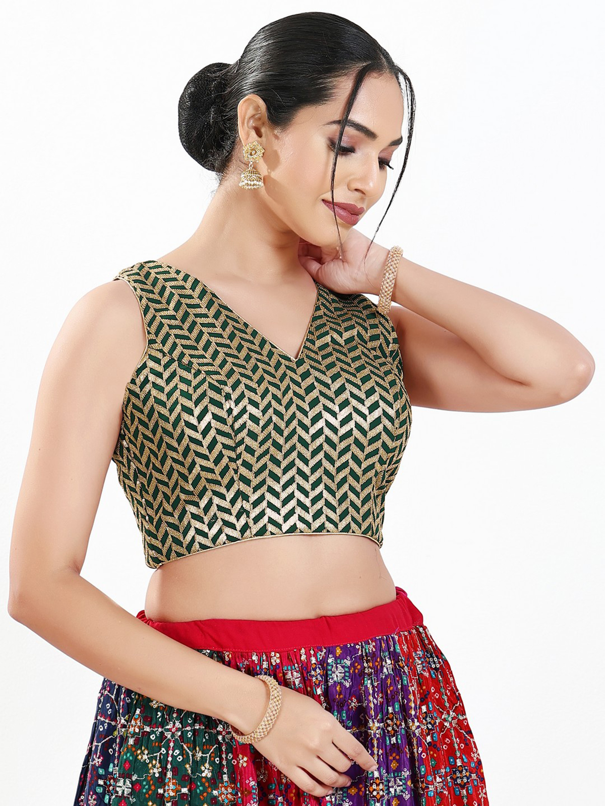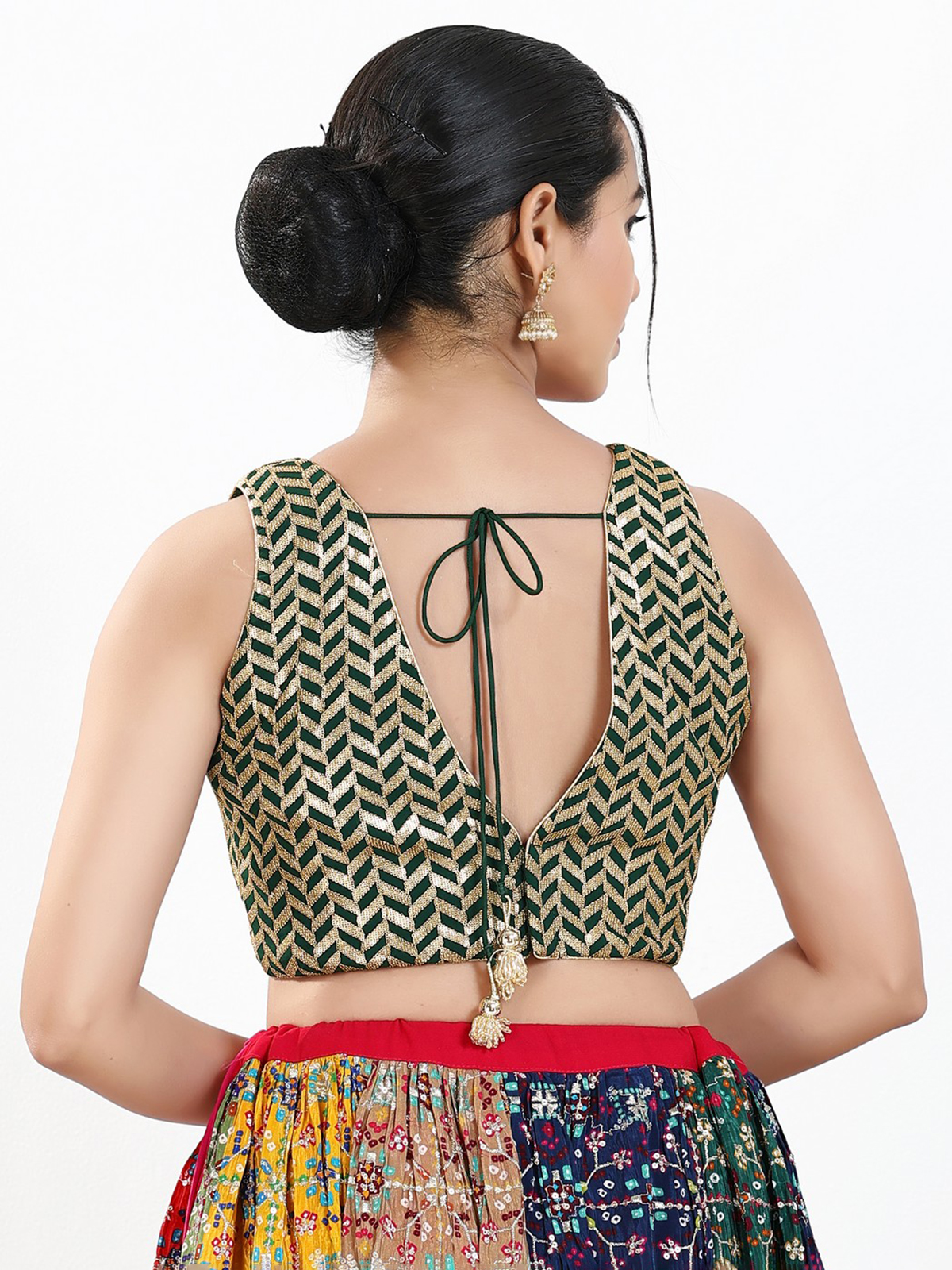 Made in silk, this bottle green ready-made blouse is adorned with sequins. The V neckline, sleeveless structure and back-open style create an elegant look for party and evening sarees.