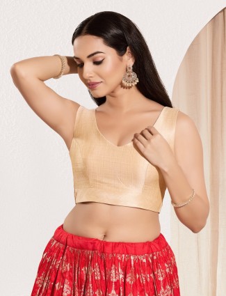 Soft cream mulberry silk brings serene refinement to this sleeveless blouse. Featuring a classic U neck and back-open detail, it pairs beautifully with pastel sarees, traditional drapes and elegant wedding ensembles.