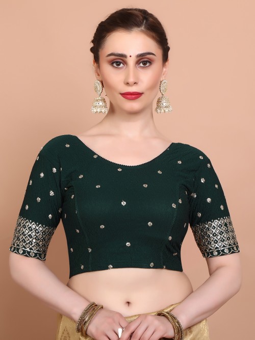 Elegantly crafted, this green lycra blouse has sequin embroidery, a round neckline, elbow sleeves, and a slip-on design—offering comfort and richness for weddings and festive dressing.