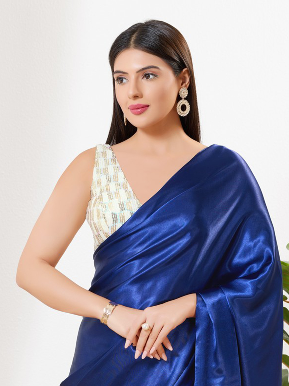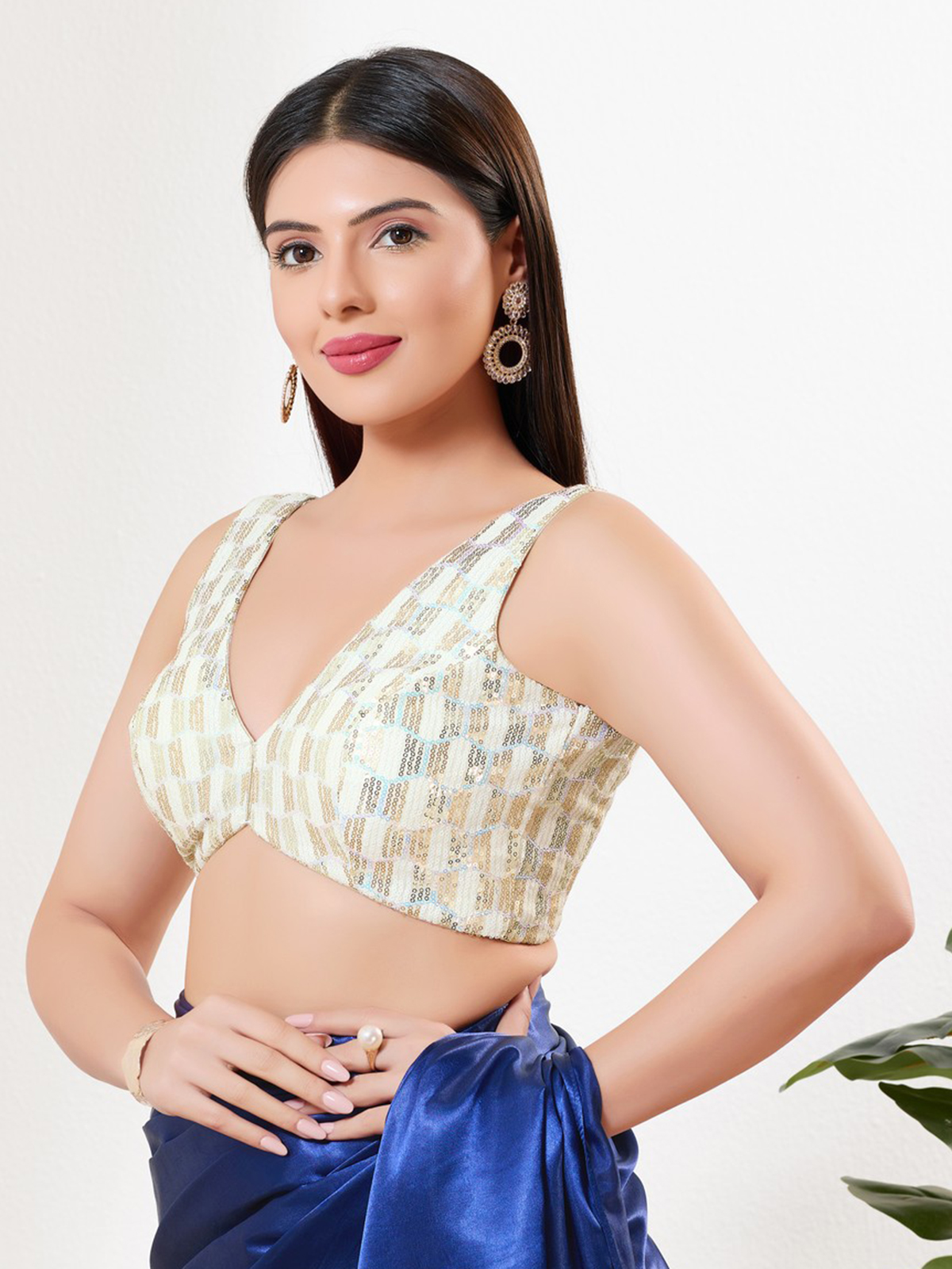 Crafted in gold sequins fabric, this blouse glimmers with detailed sequin work. The V-neck and sleeveless silhouette create a chic finish, while the back-open design enhances elegance. Perfect for festive sarees, cocktail drapes and wedding occasions.