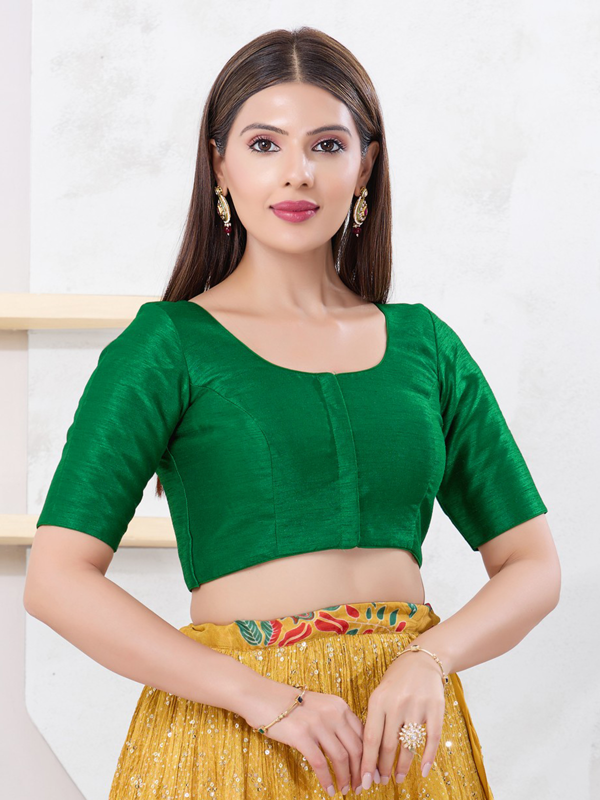 A green dupion silk blouse featuring a clean solid finish, round neck and elbow sleeves. The front-open design adds ease and timeless style. Suitable for printed, woven or festive sarees.