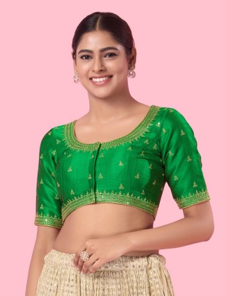 Vibrant green mulberry silk blouse featuring sequins and zari work, U neckline, elbow sleeves, and front open closure.