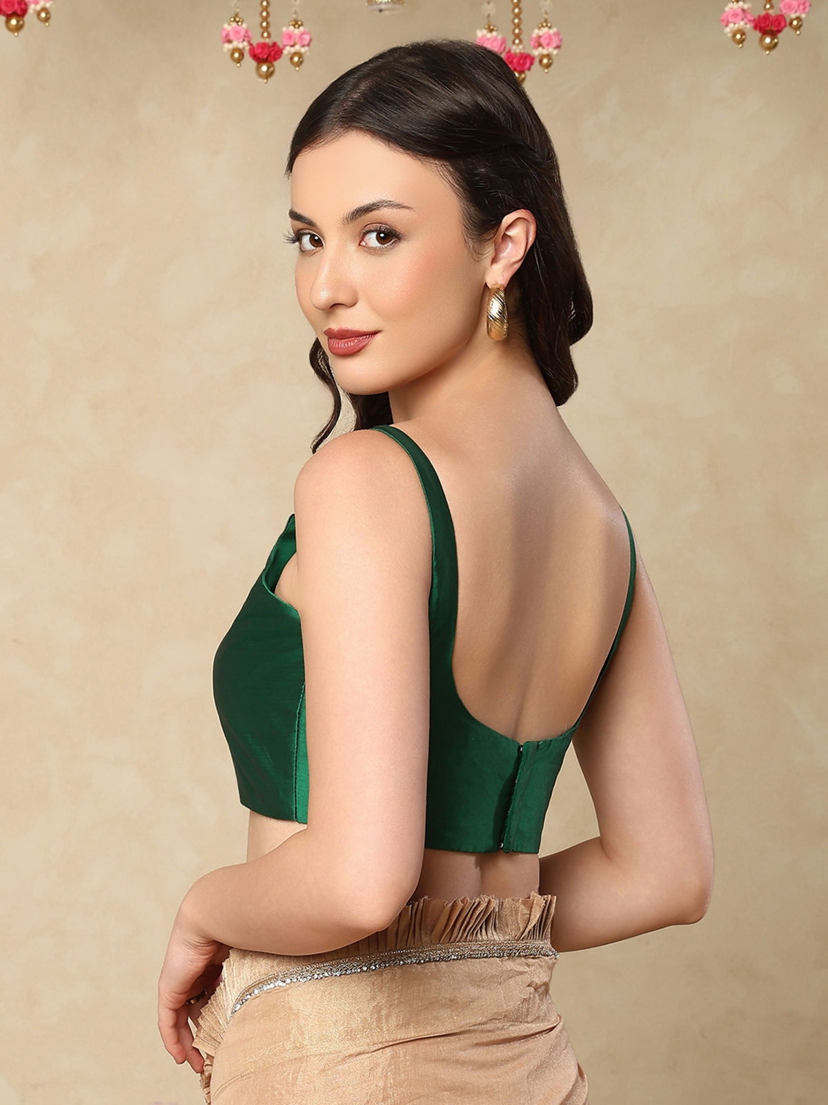 Crafted in rich green taffeta ready made blouse combines elegance and comfort. Featuring a round neckline and back opening with sleeveless design. It is perfect for pairing with festive sarees or lehengas. Ideal for weddings or special occasions, it brings understated sophistication to your ethnic wardrobe.
