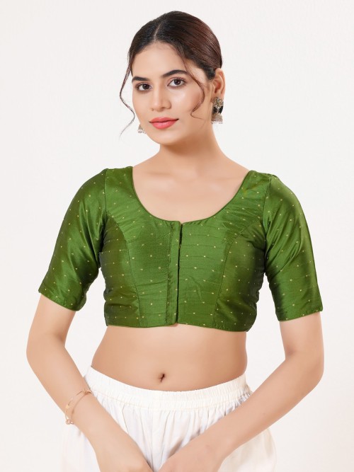 Mehendi green tafeta silk exudes earthy radiance paired with shimmering zari touches. A round neckline and front-open cut enhance convenience and charm, while elbow sleeves add tradition. A graceful match for ethnic sarees and ceremonial occasions.