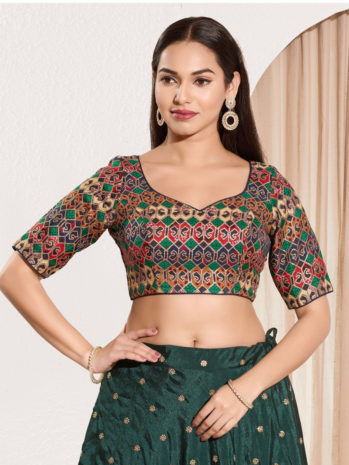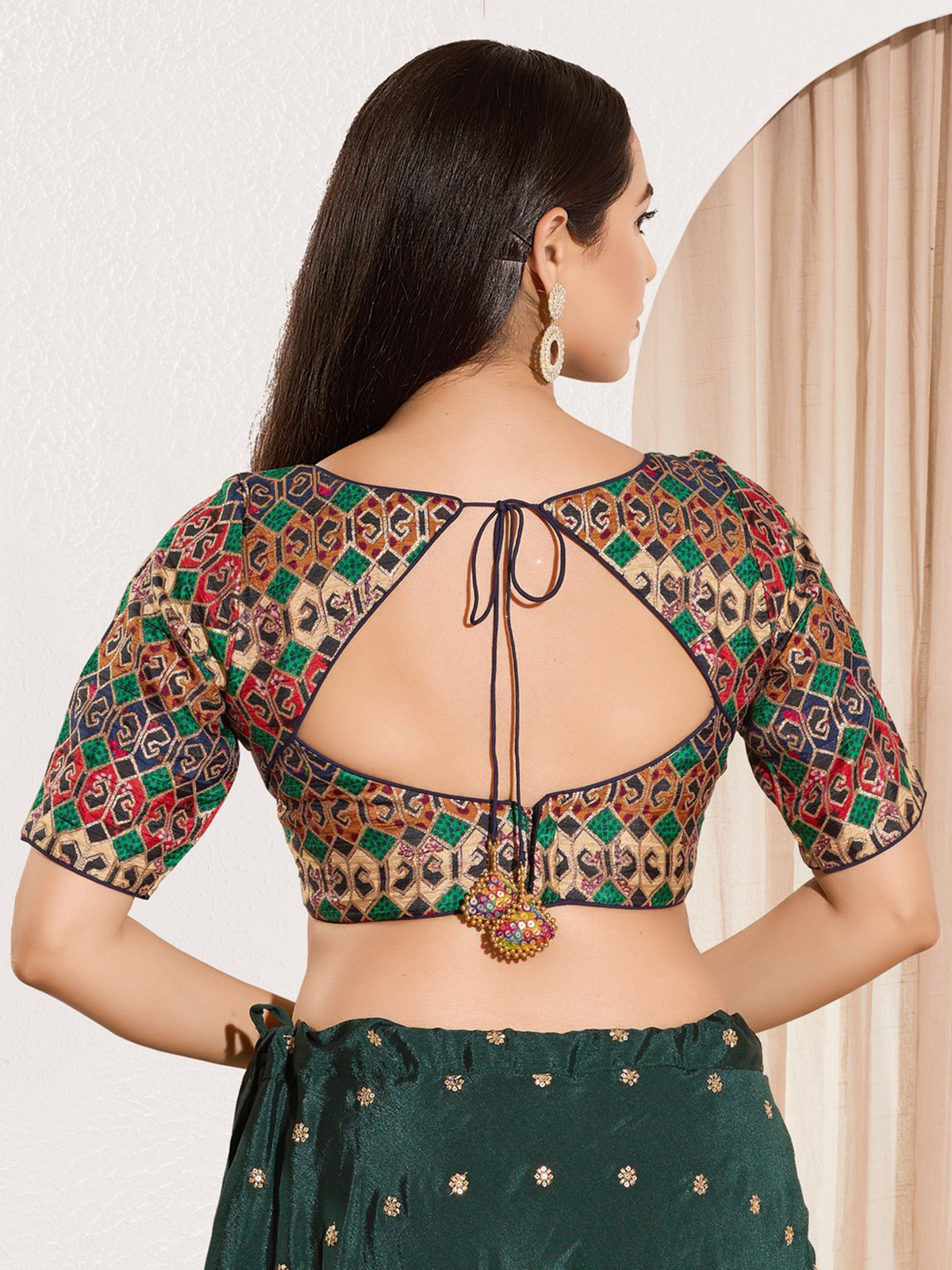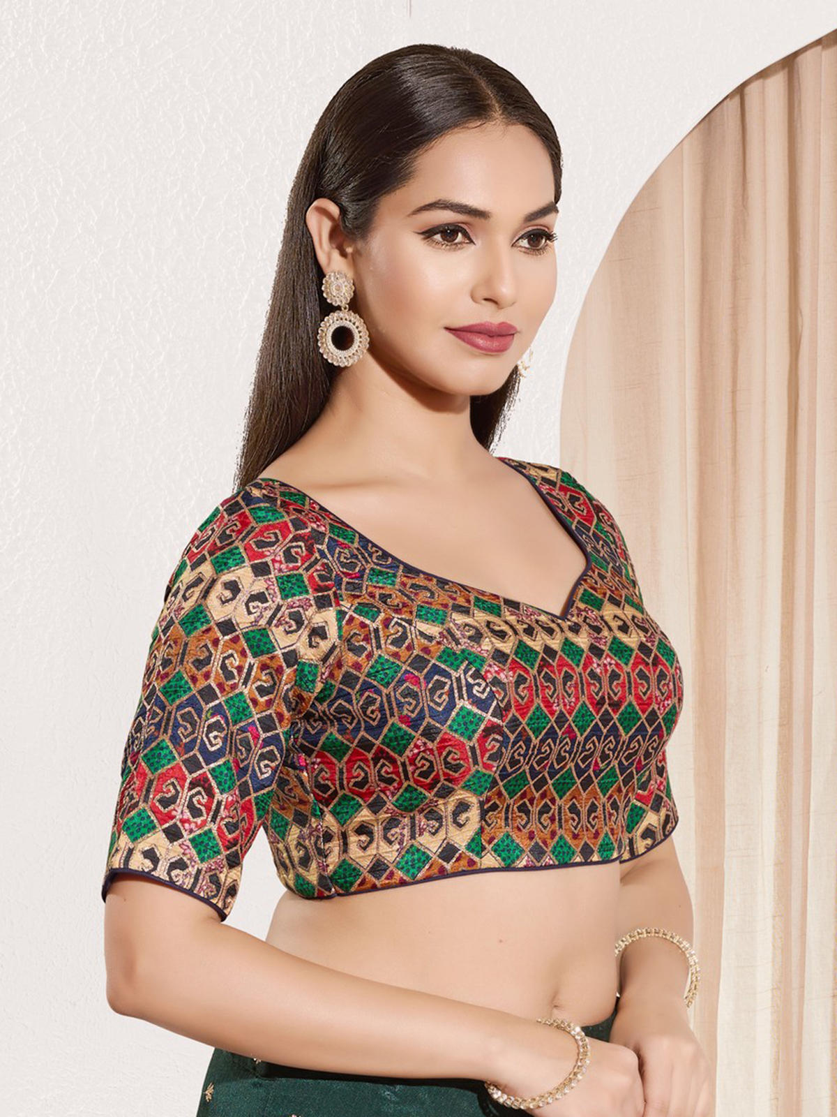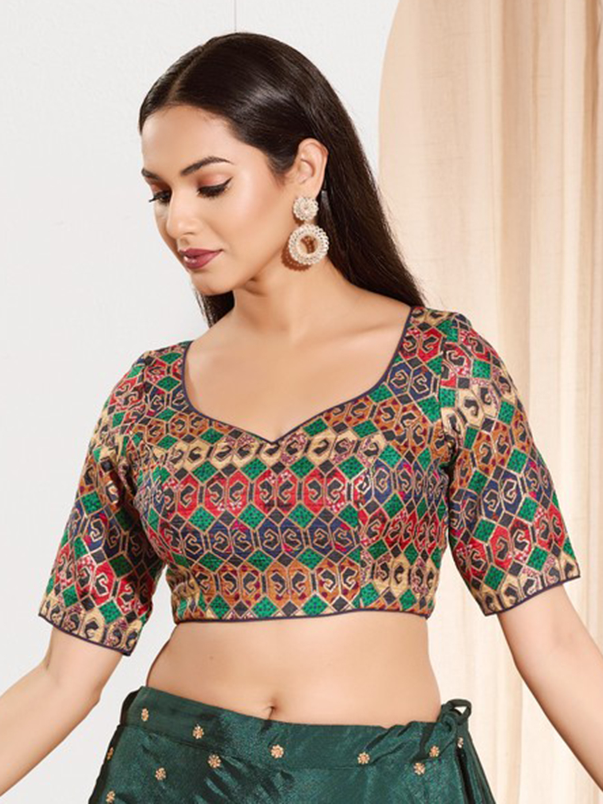 Made in brocade, this navy printed blouse features fine zari detailing with a sweetheart neckline, elbow sleeves and back-open closure—perfect for wedding and party drapes.