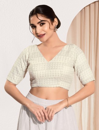 Off-white crochet adorned with sequins and embroidery radiates ethereal beauty. The V neckline and elbow sleeves shape a graceful frame, while the back-open detail adds refined sophistication. Ideal for organza, silk and pastel festive drapes.