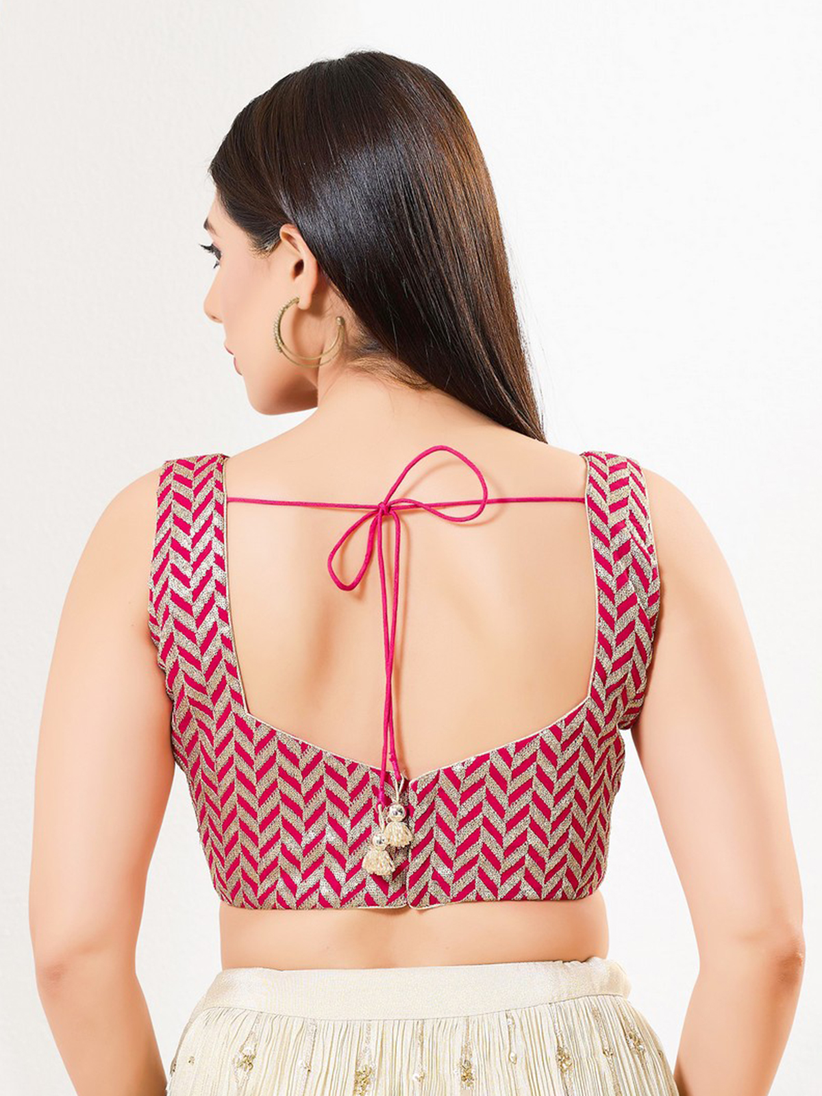 Designed in silk, this pink blouse showcases sequins with a sweetheart neckline, sleeveless silhouette and back-open closure for versatile festive styling.