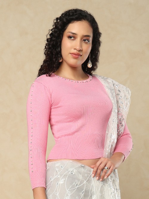 Pink Woolen Blouse With Pearl And Diamond Elegance