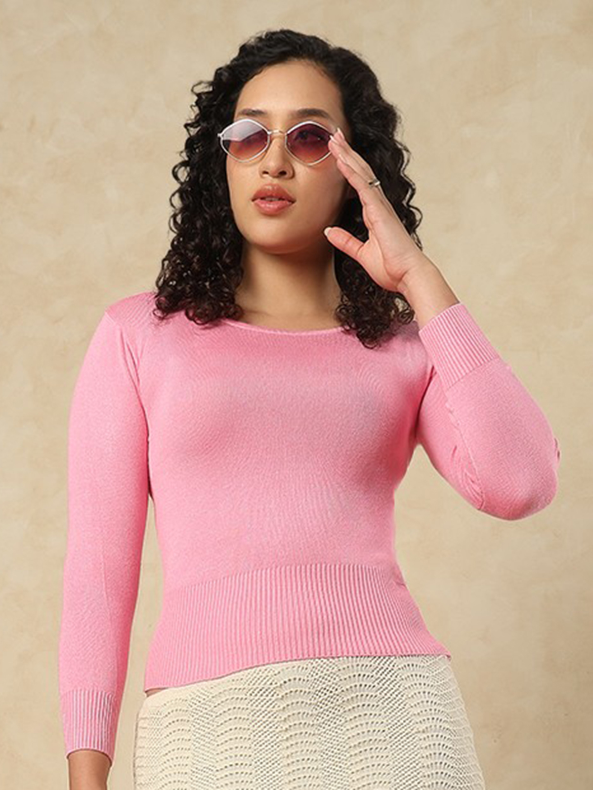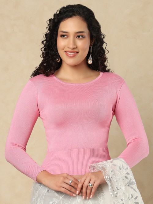 Charming and serene, this pink woolen blouse blends warmth and elegance. The round neckline and long sleeves create a graceful silhouette, ideal for winter celebrations and festive gatherings.