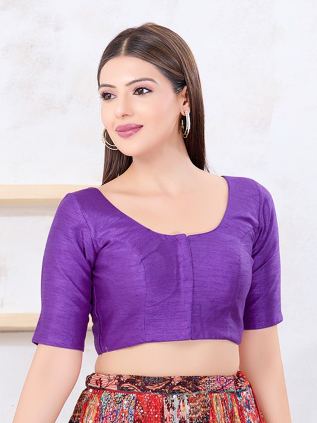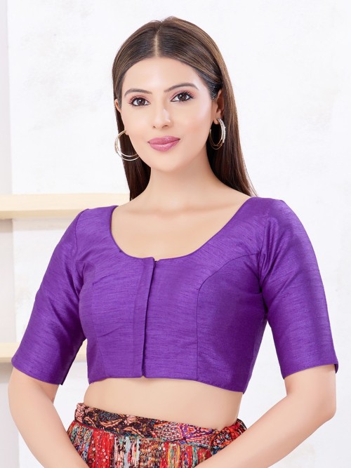 Made in rich purple dupion silk, this blouse offers a classic solid finish with a round neckline and elbow sleeves. The front-open styling provides ease and elegance, ideal for pairing with contrasting or matching sarees for festive or daytime functions.