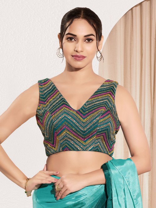Rama Blue V Neck Net Ready Made Blouse