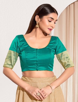 Traditional yet stylish, this rama green silk blouse is adorned with zari weaving and tailored with a round neck and elbow sleeves. A timeless pick for poojas, receptions, or cultural festivities.