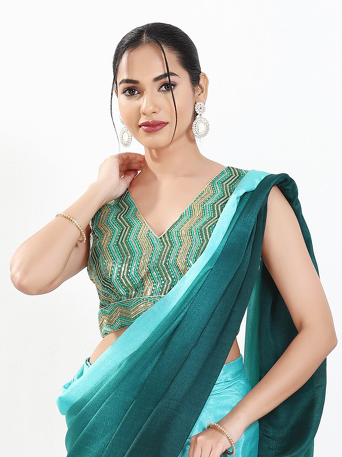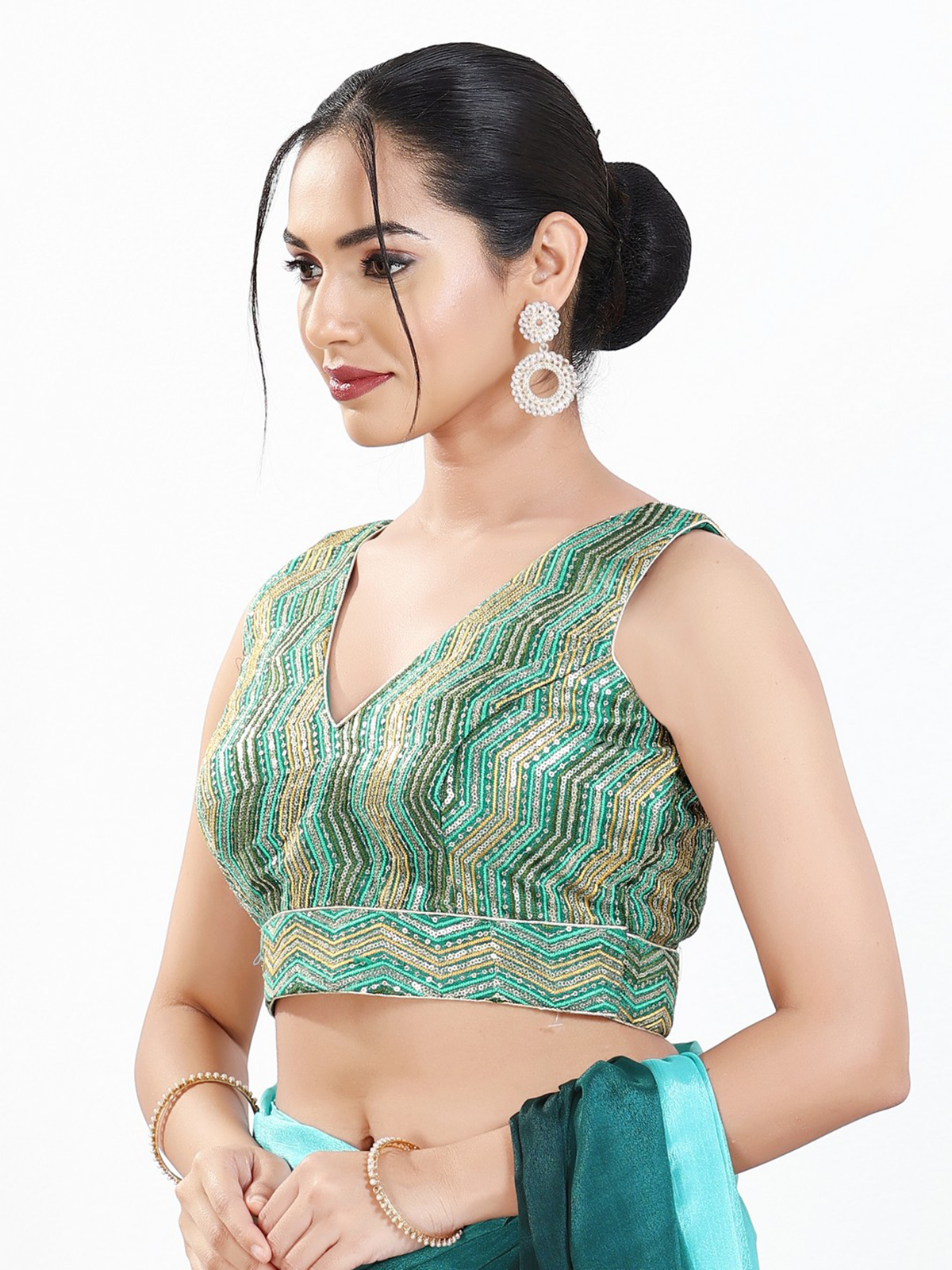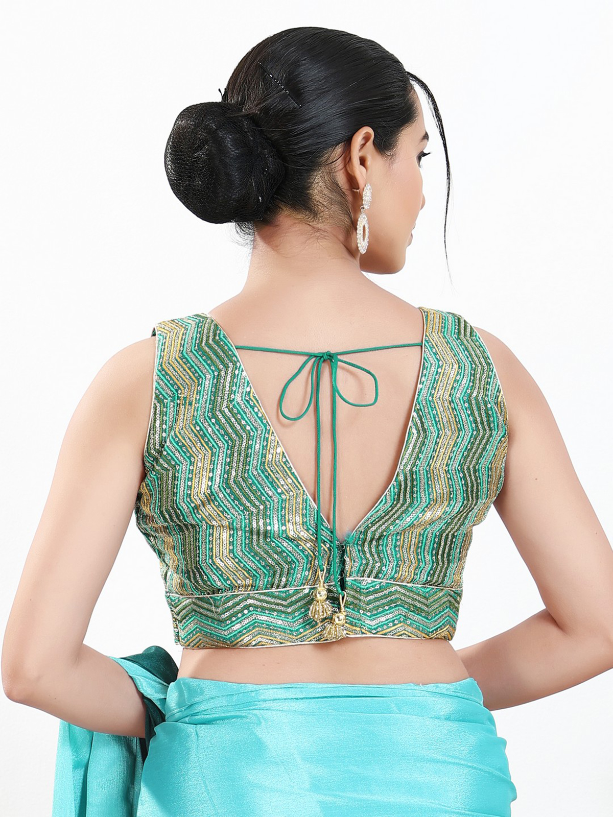 Designed in silk, this rama green blouse features embroidered and sequinned accents with a V neckline, sleeveless design and back-open pattern.