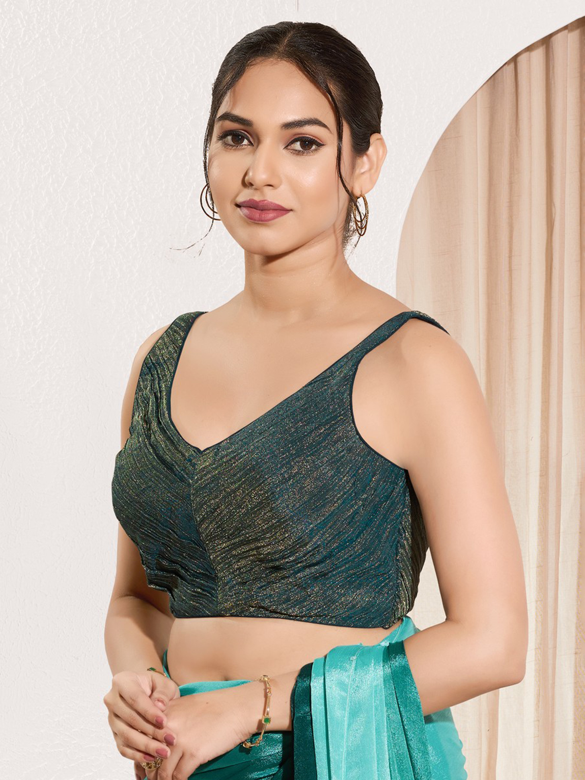 Made in glossy tissue silk, this rama green blouse features a sweetheart neckline, sleeveless silhouette and back-open design, ideal for celebratory sarees.