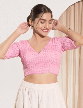 Soft and subtle, this baby pink polyester blouse is enhanced with delicate embroidery and glimmering sequin accents. Styled with a V neck and elbow sleeves, it suits floral or pastel sarees for daytime celebrations and intimate gatherings.