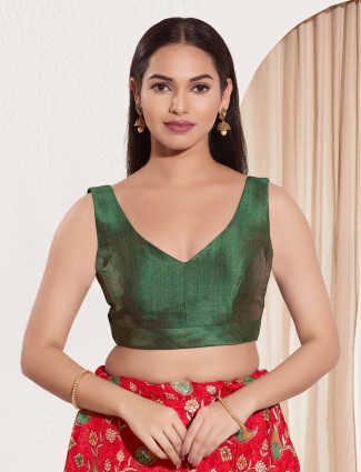 Minimal yet festive, this dark green silk blouse features fine zari weaving and a sleeveless U neckline perfect for layering with sarees in earthy or vibrant tones.