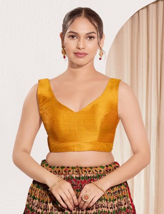 Make a graceful impression with this mustard yellow silk blouse featuring fine zari weaving. The sleeveless cut and U neckline lend it a traditional yet chic appeal—perfect for pairing with festive sarees or lehengas for weddings and cultural events.