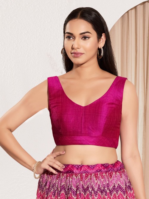 Crafted in rich purple silk, this sleeveless blouse is adorned with traditional zari weaving. Its U neckline offers timeless elegance, making it a striking companion for designer sarees or lehengas at cultural or festive events.