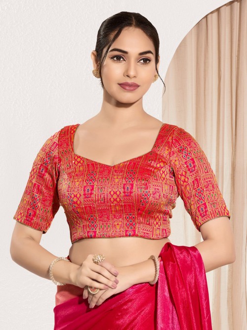 Turn heads in this radiant red jacquard blouse adorned with zari and sequins. Featuring a classic round neck and elbow sleeves, it blends tradition with elegance perfect for festive occasions and ethnic celebrations.
