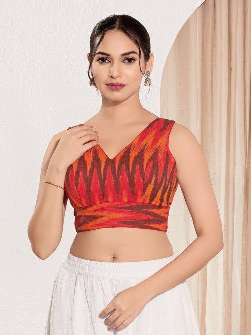 Bright and breezy, this red printed cotton blouse features a sleeveless silhouette and classic V neck. A colorful choice for casual sarees or day events with a traditional twist.