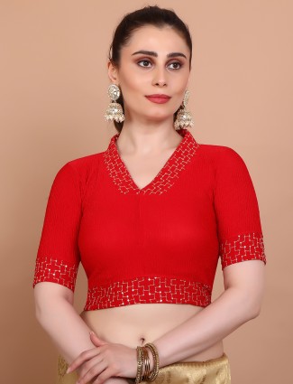 A vibrant choice, this red lycra blouse is beautifully detailed with resham, sequins, and embroidery. Featuring a V neck, elbow sleeves, and no opening, it pairs gracefully with traditional sarees.