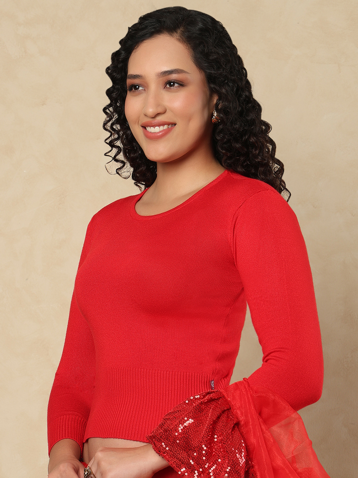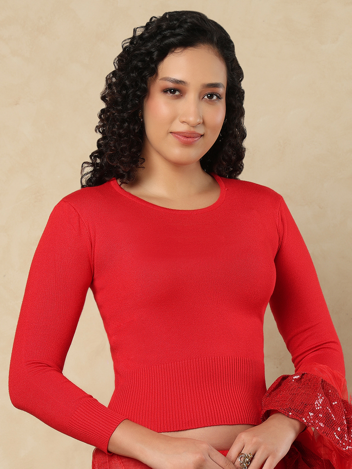 In vivid red wool, this blouse radiates joy and elegance. The round neckline and long sleeves merge comfort with celebration—ideal for pairing with silk or georgette sarees.