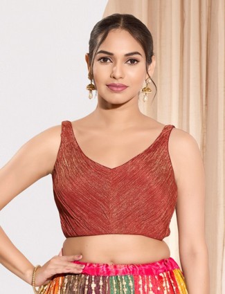 Designed in tissue silk, this rust brown blouse offers subtle shimmer with a sweetheart neckline, sleeveless fit and back-open design for festive styling.