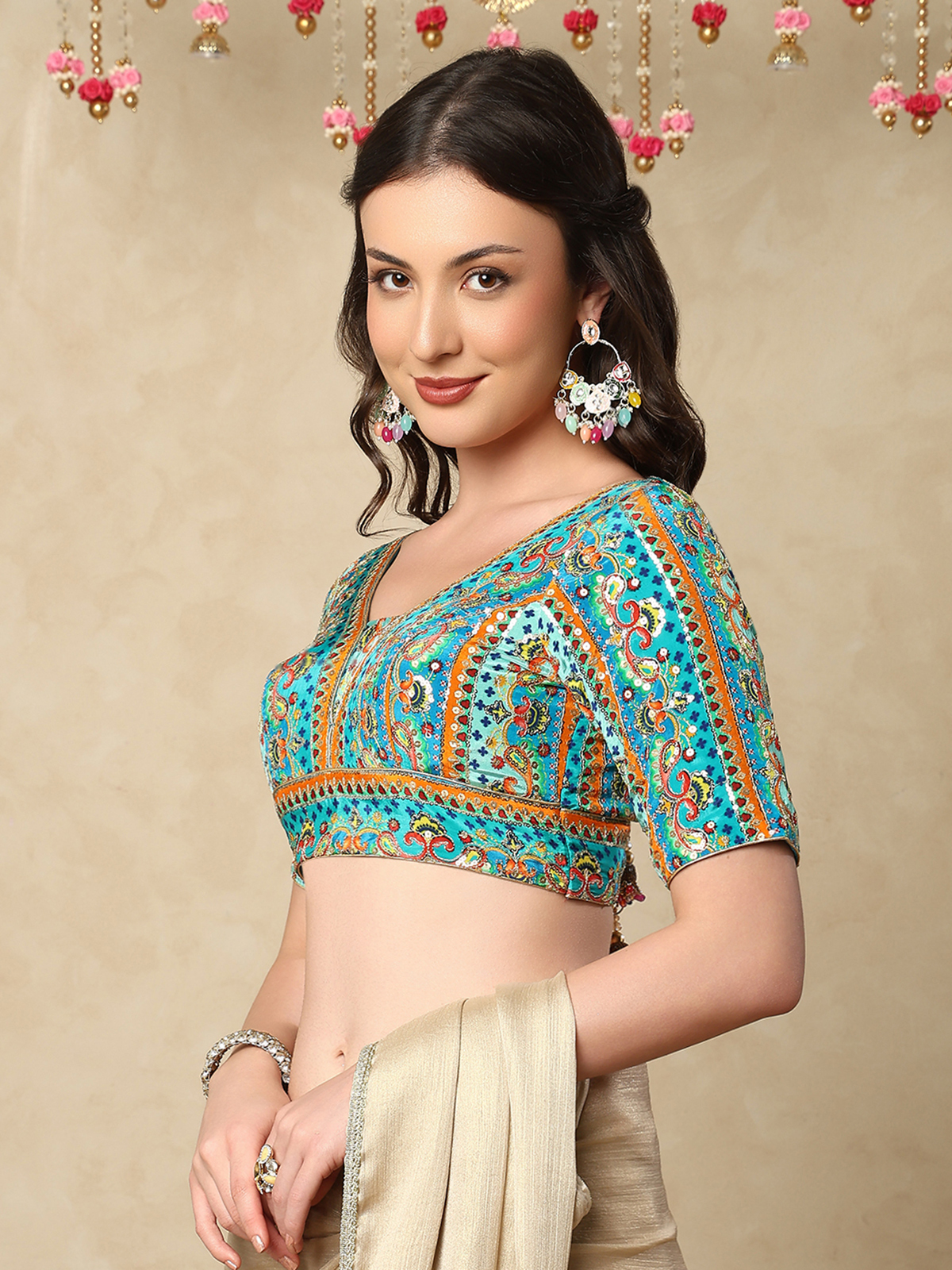 Radiate charm in this sea blue silk ready made blouse. Featuring embroidery and sequins work. Designed with a V neckline and back opening, its elbow sleeves add graceful elegance. Perfect for festive gatherings, weddings or celebrations. It pairs effortlessly with sarees or lehengas for a refined, sparkling appearance.