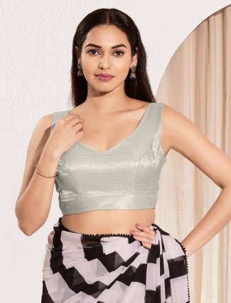 This silver silk blouse shines with delicate zari weaving. Its sleeveless design and sweetheart neckline lend modern grace to ethnic outfits, perfect for festive evenings.