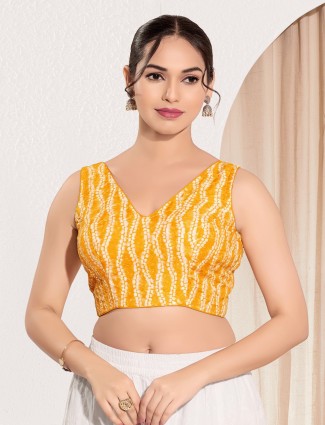 A sleeveless blouse in mustard yellow viscose rayon, detailed with fine sequins and a stylish V neckline. Ideal for casual ethnic occasions, it pairs well with bright printed sarees.