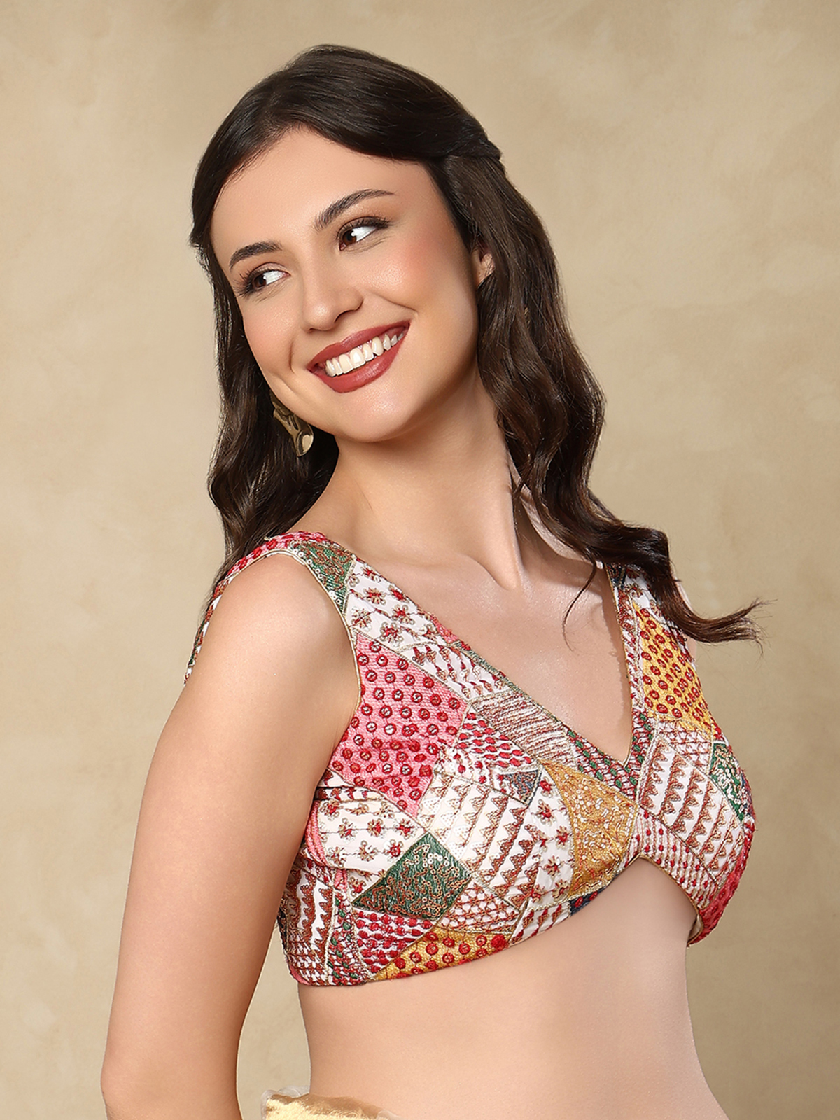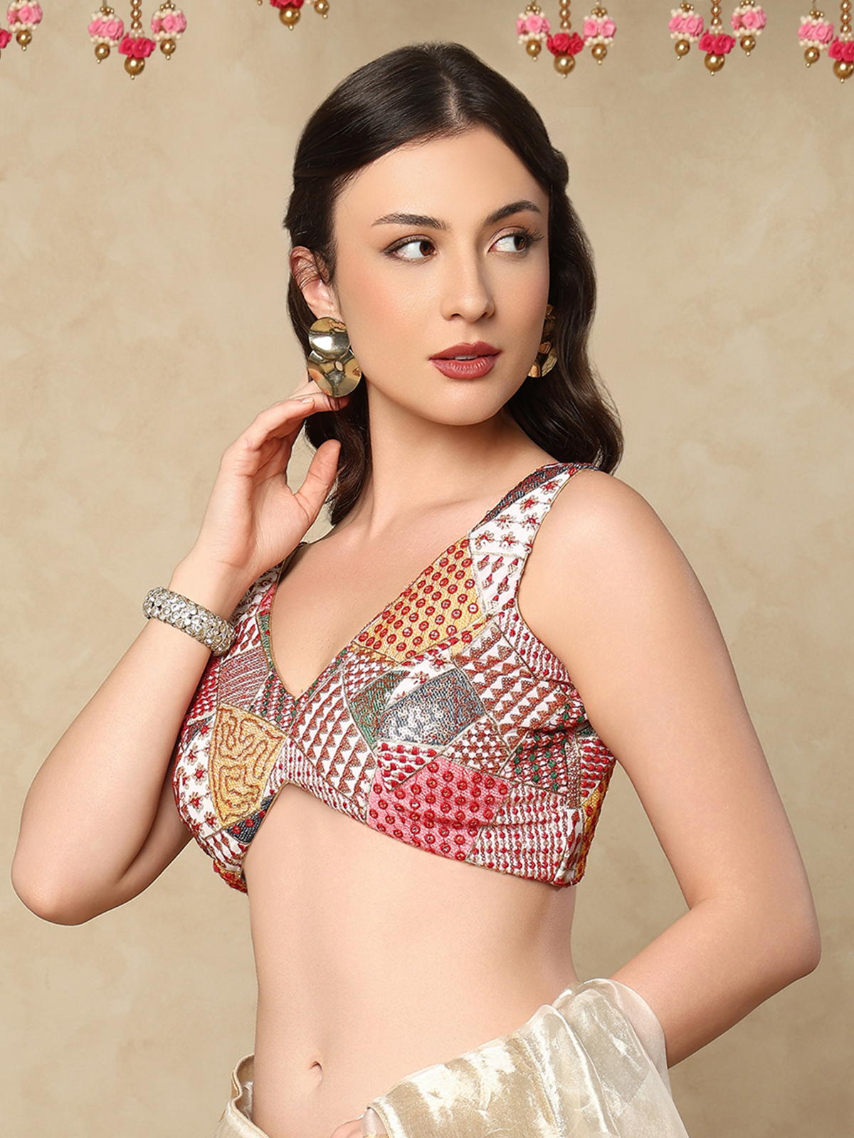 This white georgette ready made blouse glows with embroidery and sequins work. Designed with a V neckline, back opening and sleeveless design. It offers modern yet elegant festive appeal. Perfect for wedding functions or special celebrations. It pairs beautifully with sarees or lehengas for a sophisticated look.