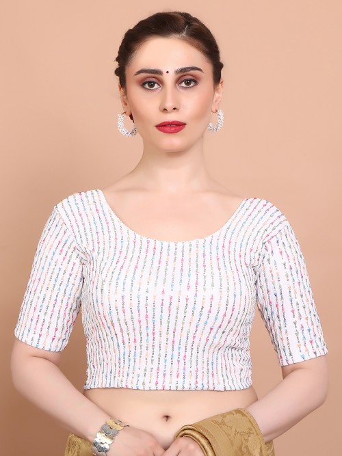 This white lycra blouse features elegant embroidery and subtle sequins. Designed with a stretch fit, round neck, elbow sleeves, and no opening, it offers a smooth, contemporary silhouette.