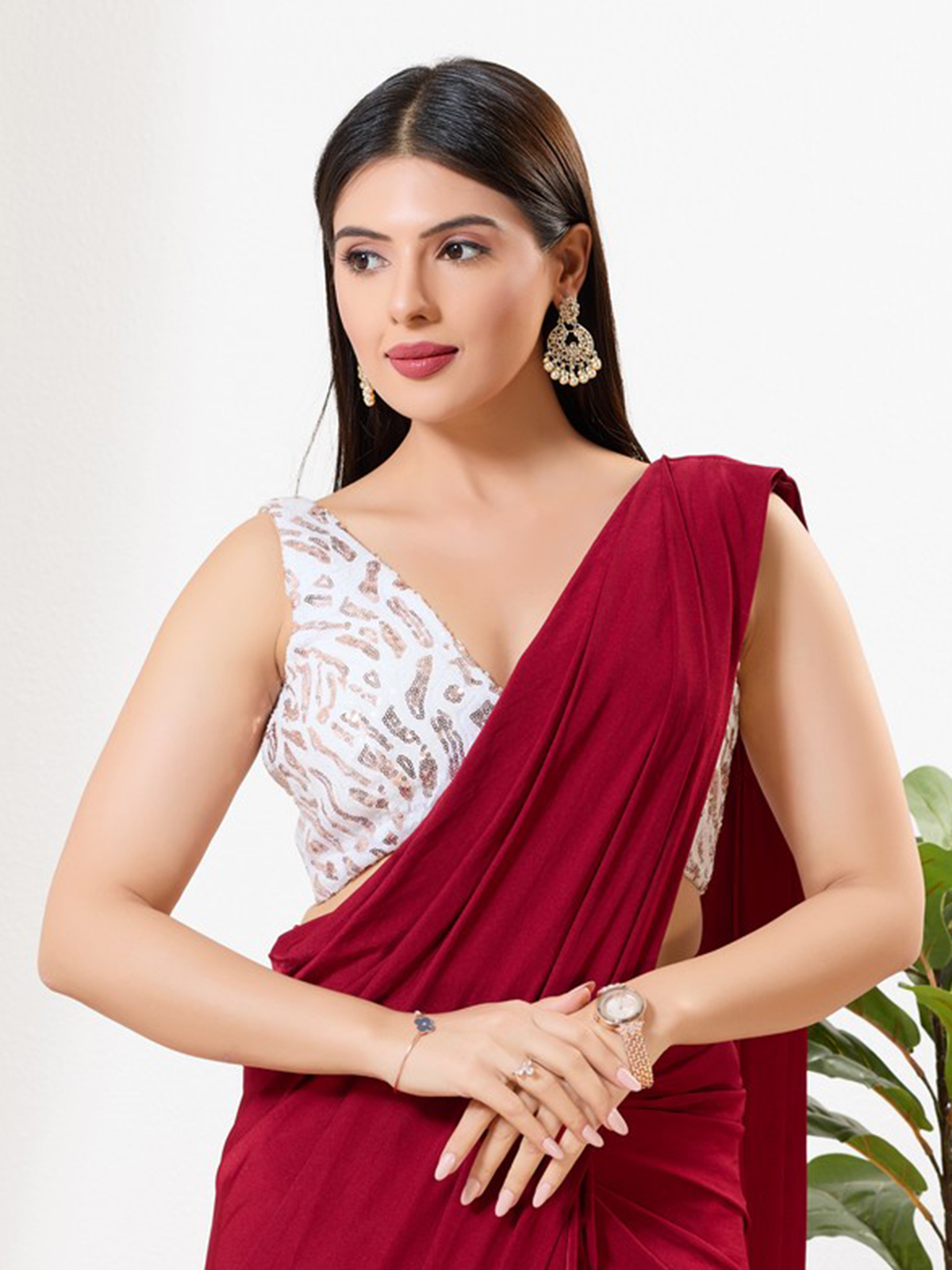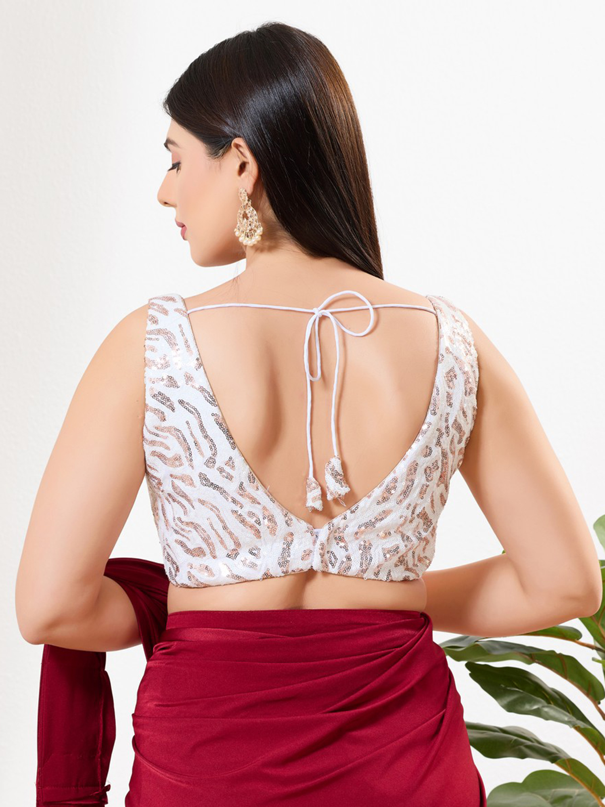This white sequins blouse glitters with finely worked sequin detailing, offering a soft festive shine. With a V neckline and sleeveless cut, it maintains a refined, modern look. The back-open pattern adds charm, pairing beautifully with bright or pastel sarees.