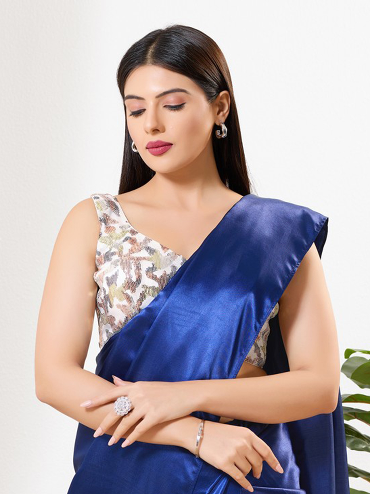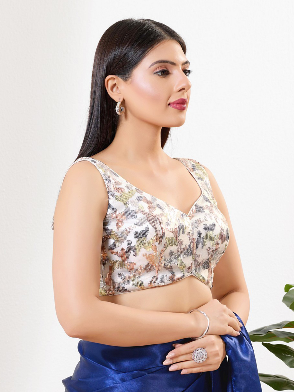 Designed in silk, this white blouse carries sequin detailing with a sweetheart neckline, sleeveless silhouette and back-open design for festive occasions.