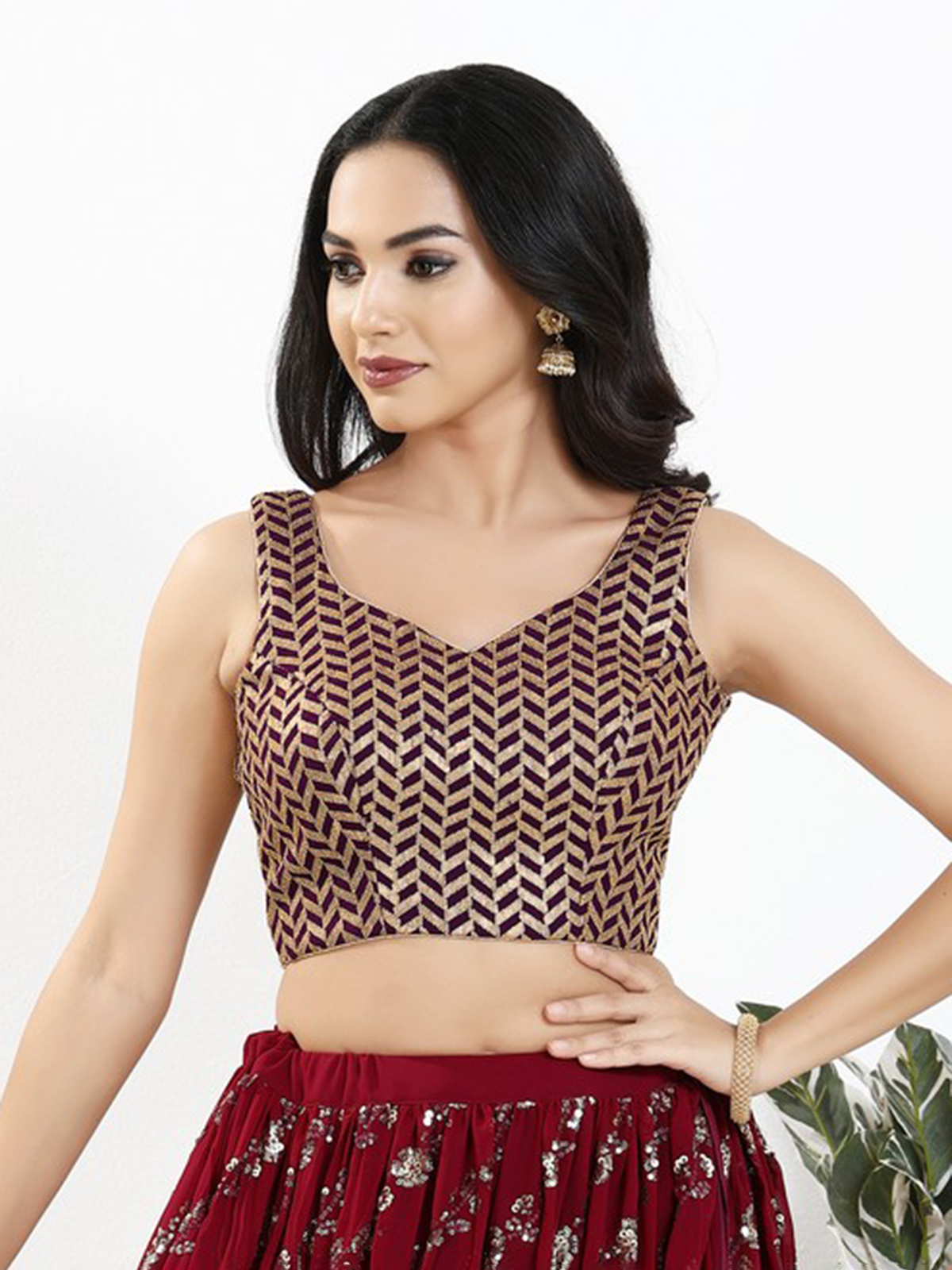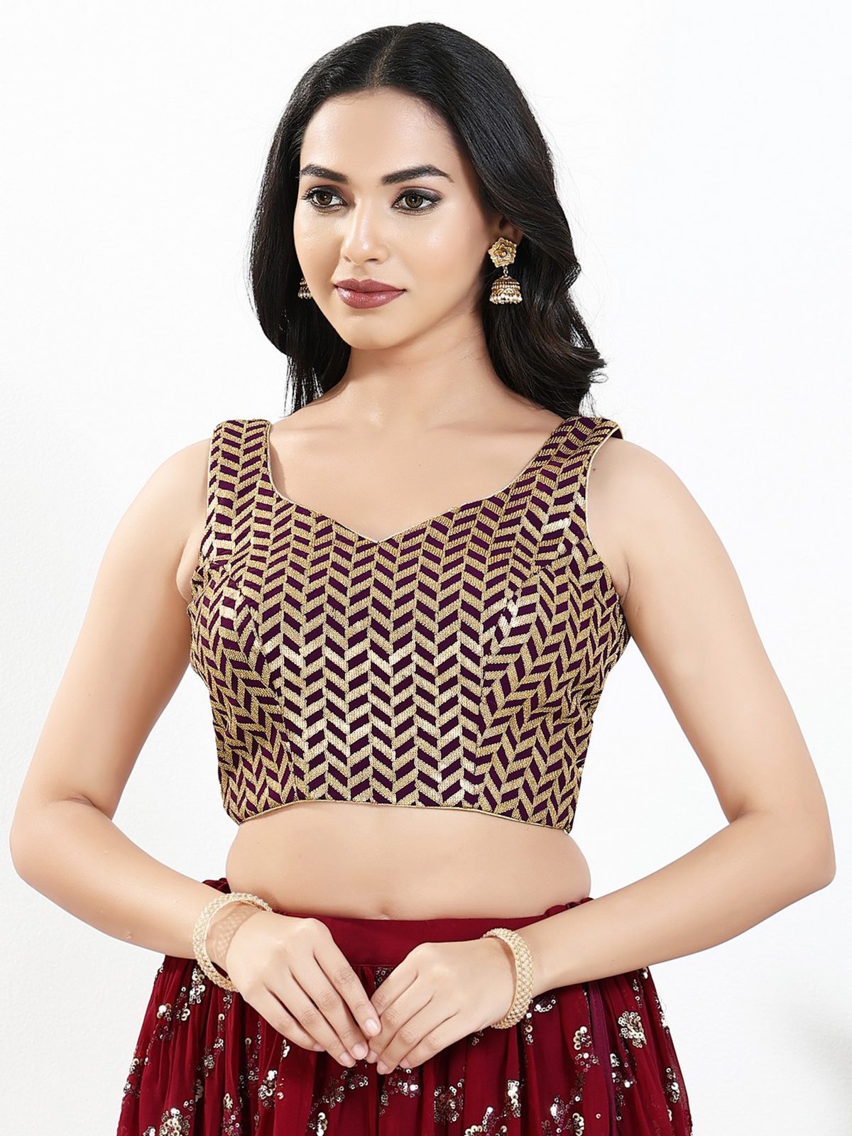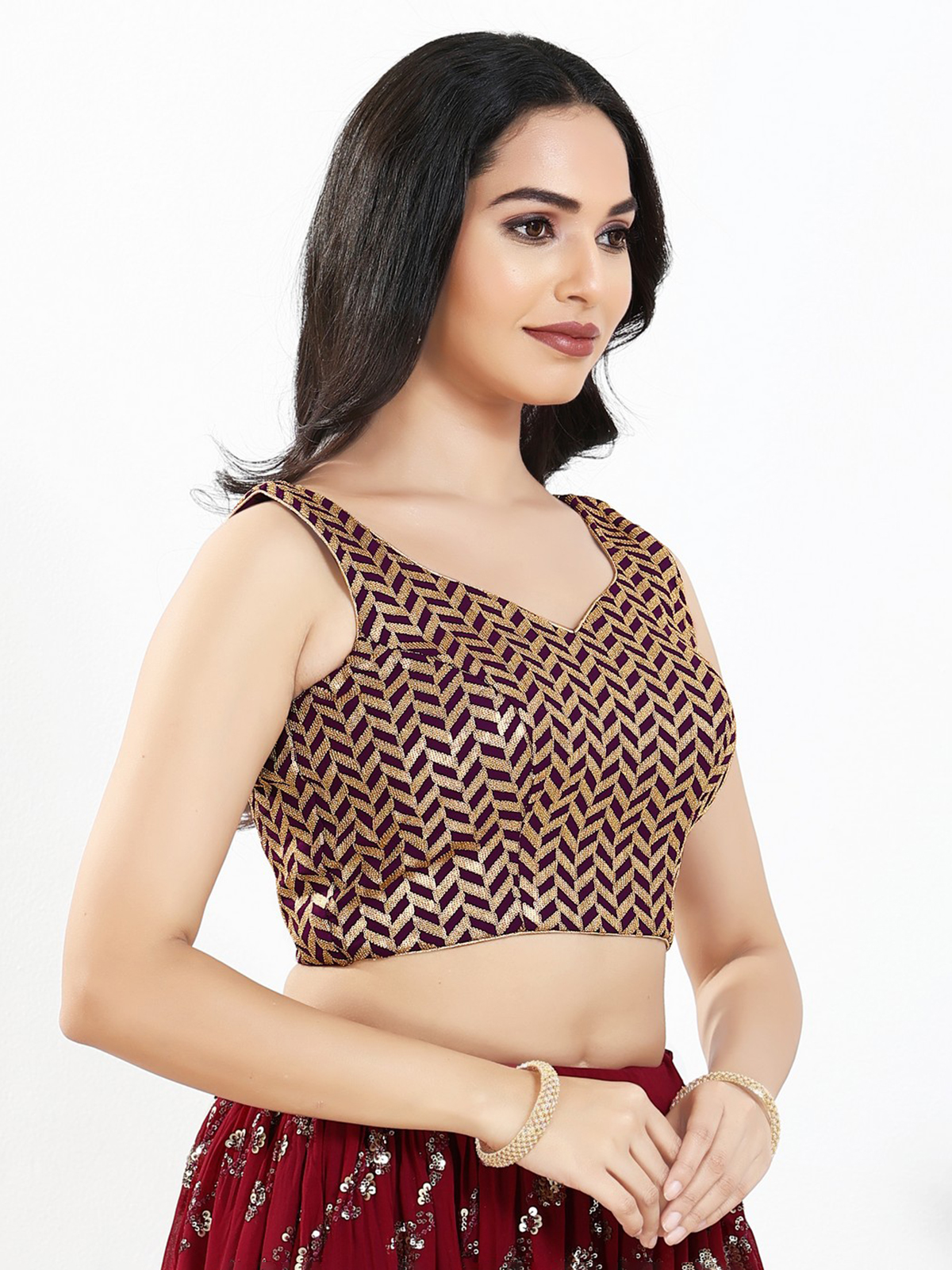 This wine silk blouse features a delicate sequin finish with a sweetheart neckline, sleeveless cut and back-open design for elegant evening wear.