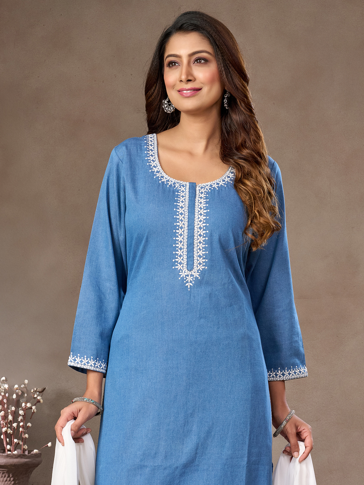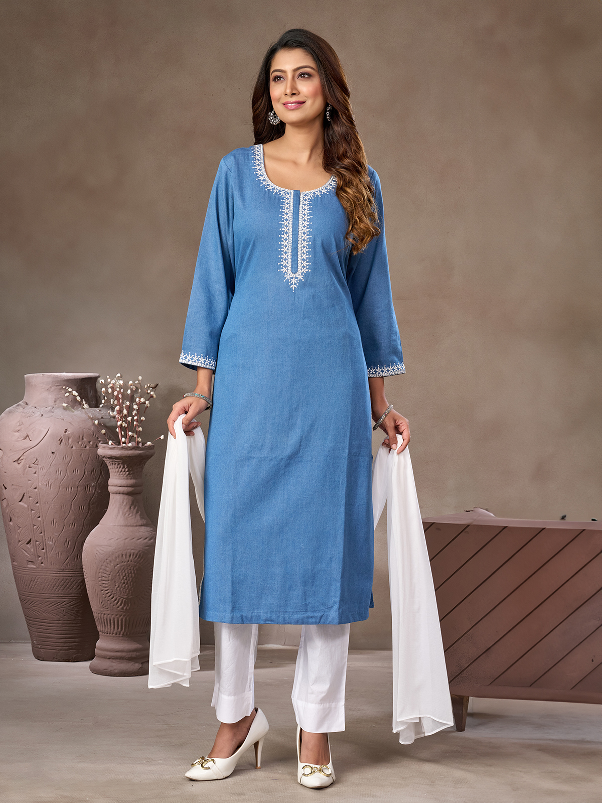 In breathable aqua cotton silk, this suit features elegant embroidery and a round neckline. The quarter sleeves and light dupatta make it ideal for festive daytime functions or pujas.