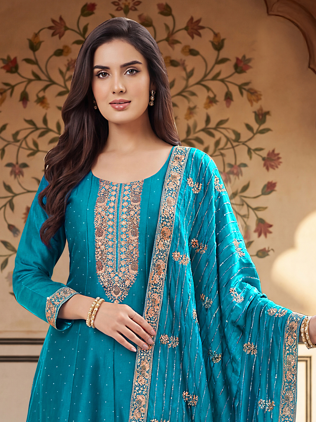 Styled in refreshing aqua silk salwar suit is highlighted with elegant embroidery, sequins, cutdana and stone work. Featuring a round neckline and full sleeves, it is teamed with a pant and dupatta for luxurious festive occasions.