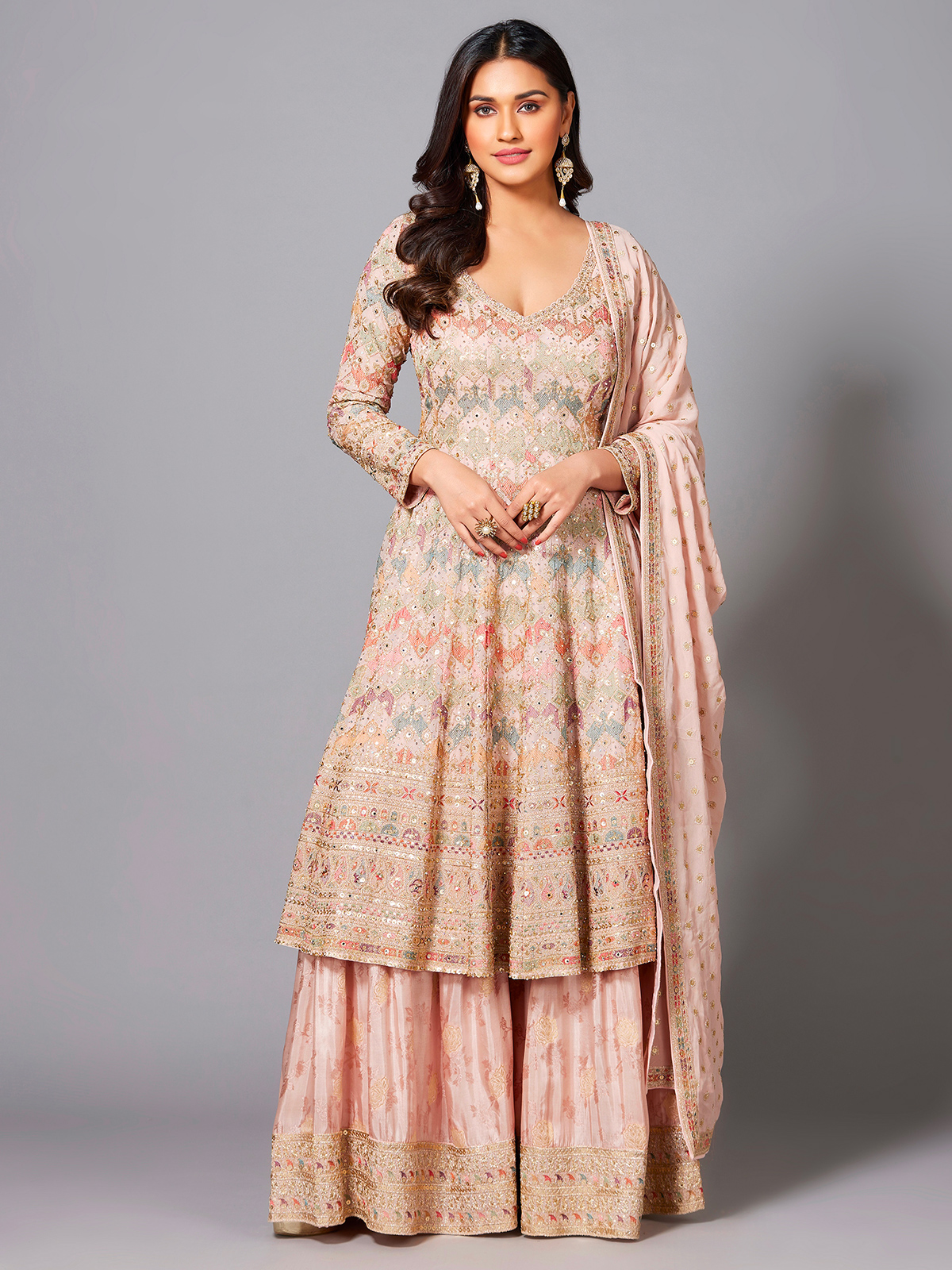 Enhance your wedding collection with our light pink georgette sharara suit, featuring colorful embroidery, resham, zari, sequins, and mirror work. With a V-neck and full sleeves, it's a versatile choice paired with a matching dupatta.