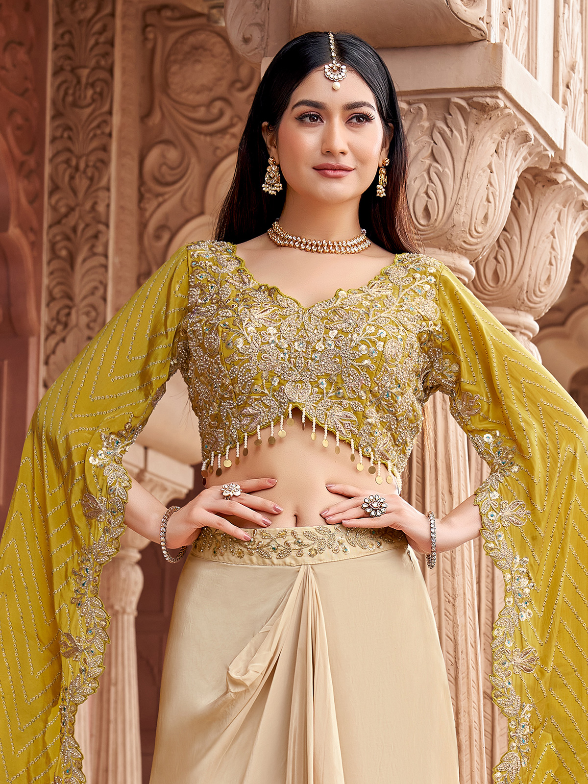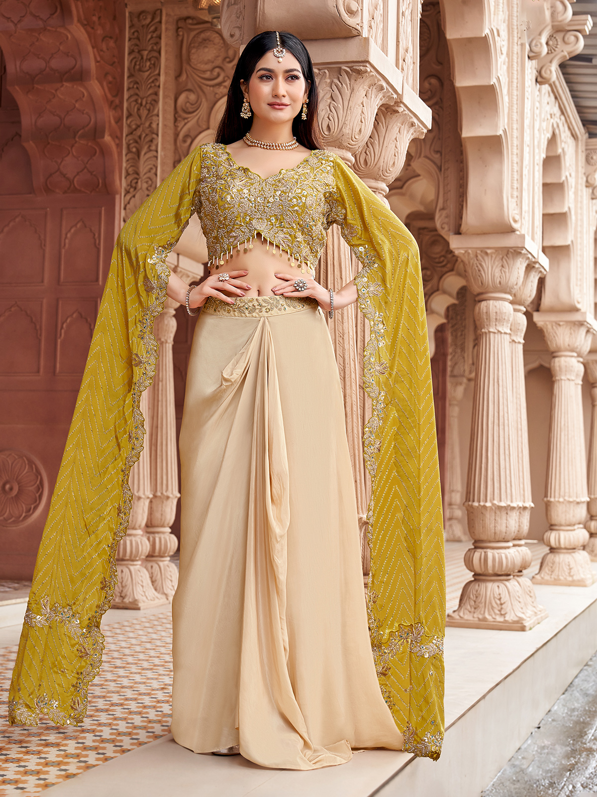 Elegant beige and olive satin silk Indo-Western suit enhanced with sequins, resham, pearls, beads, and coin work. Styled with a U neckline, it makes a versatile choice for weddings, parties, or receptions, bringing ethnic richness with a contemporary touch.