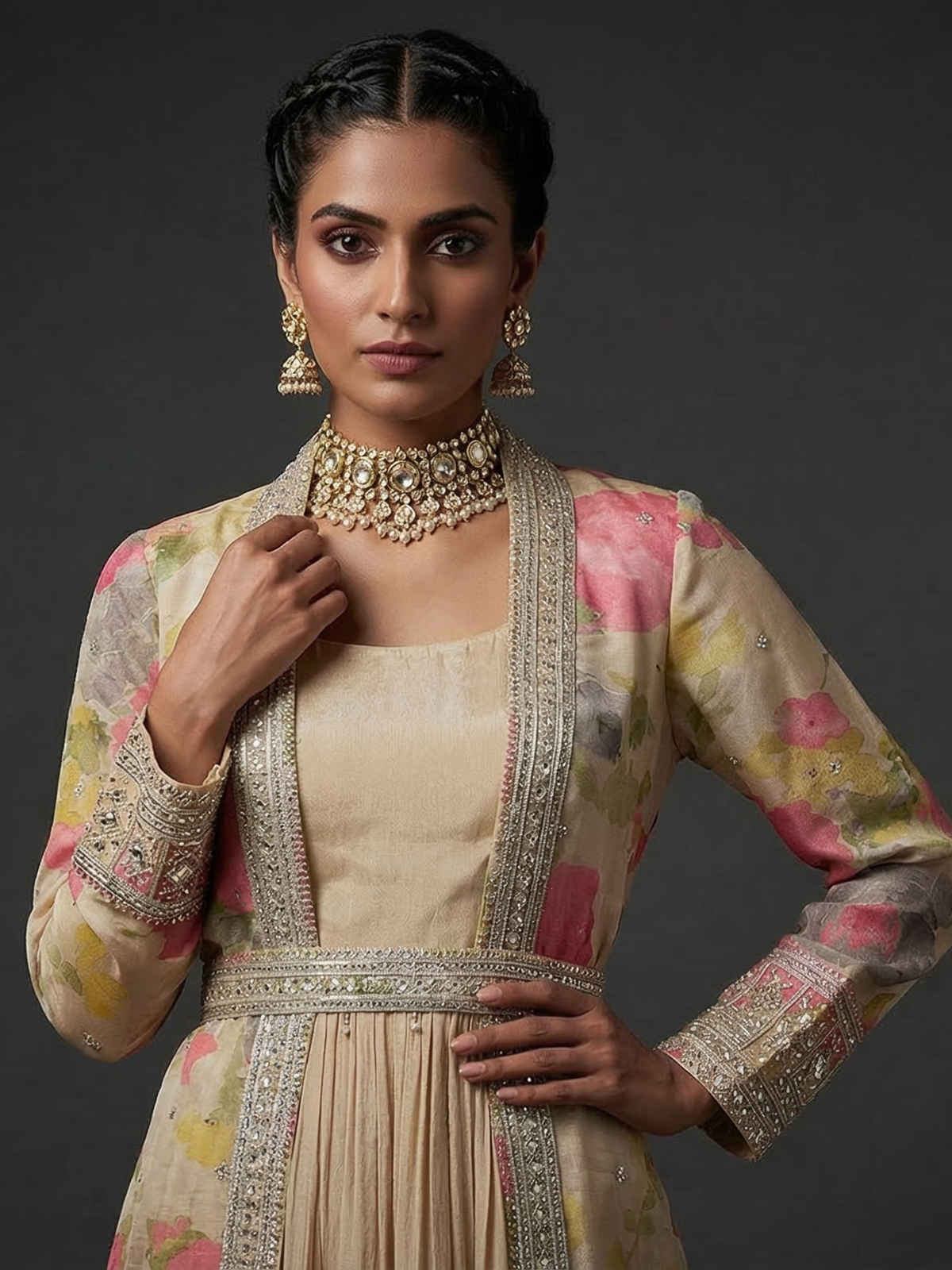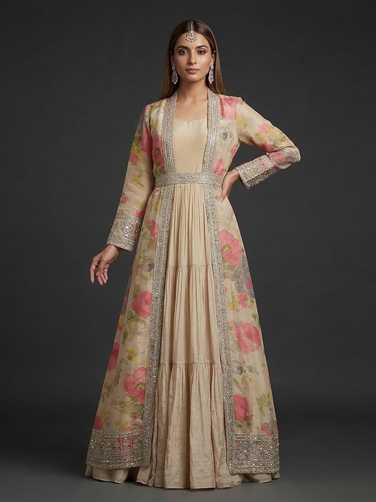 Beige Chiffon Anarkali Suit With Long Jacket Style