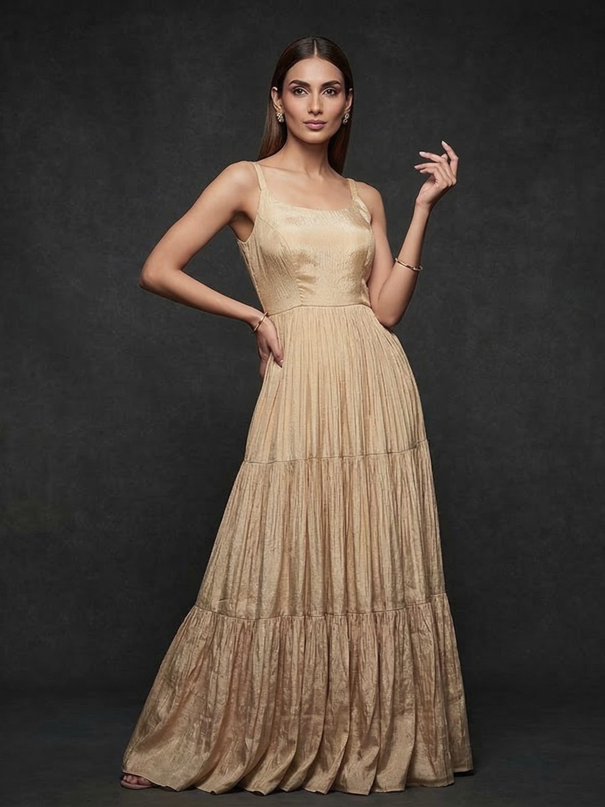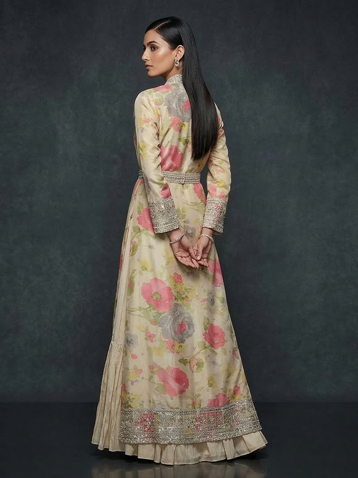 Graceful charm comes alive in this beige chiffon long jacket style Anarkali ensemble, designed to exude regal elegance. Adorned with resham, sequins, pearls, mirror and diamond embellishments, it shimmers beautifully with movement. The layered silhouette enhances its grandeur, making it a perfect pick for weddings, sangeet celebrations and festive occasions.