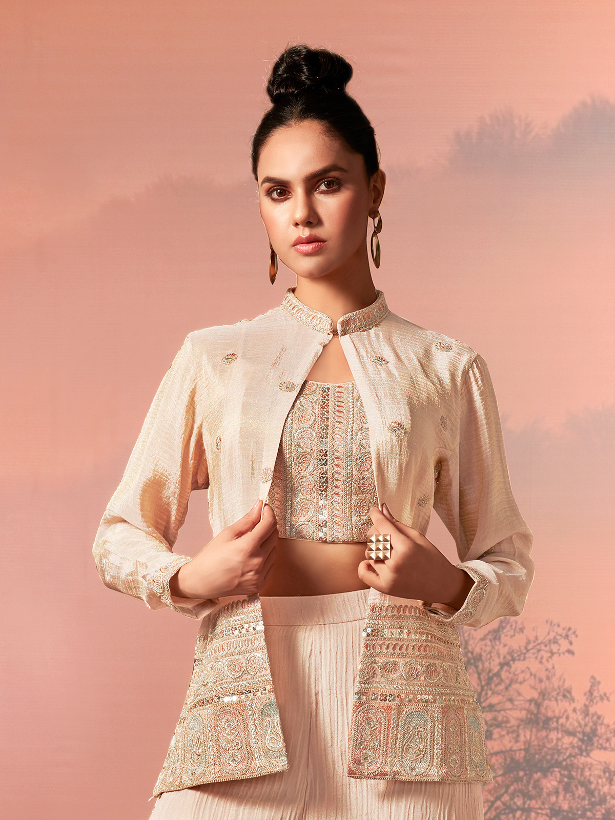 Crafted in lightweight beige chiffon jacket style palazzo suit. Features elegant embroidery accented with sequins and fine thread work. The flowing silhouette offers comfort with festive refinement. Finished with a palazzo bottom, it makes a graceful choice for weddings, festive gatherings and reception celebrations.