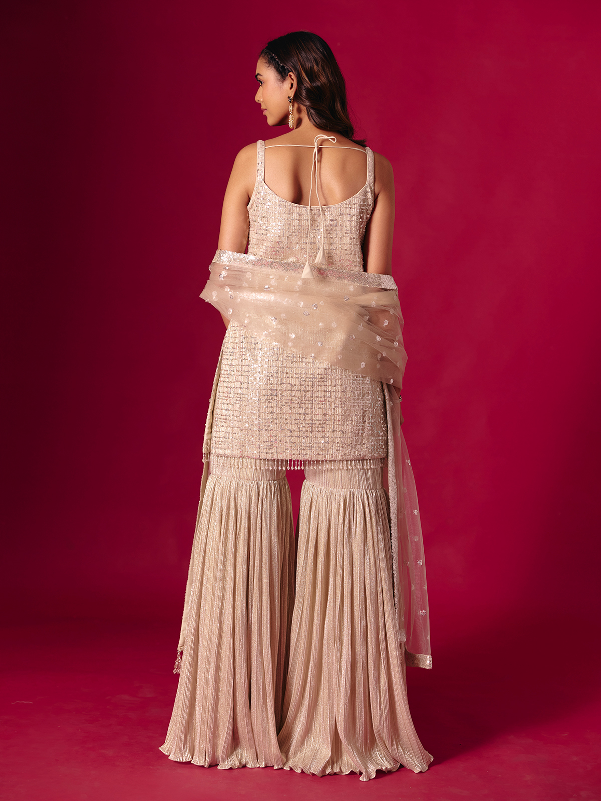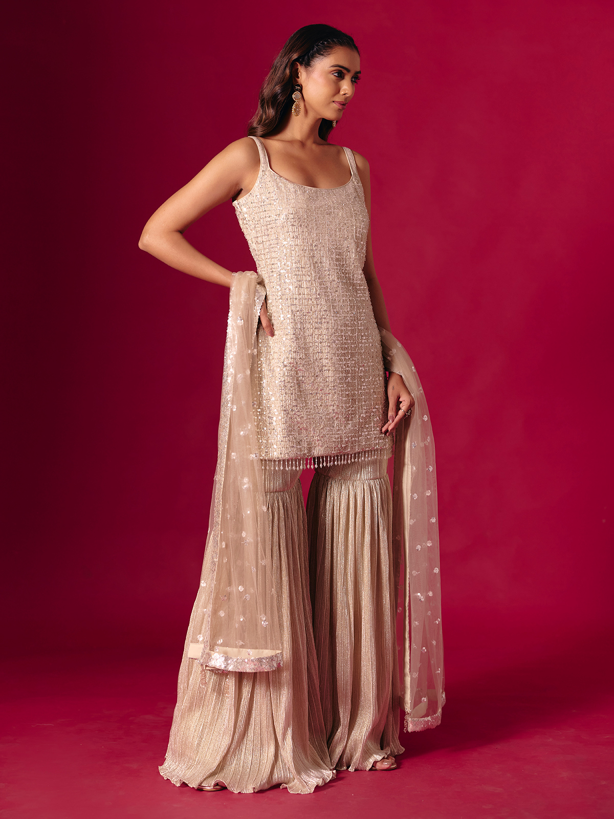Soft beige chiffon takes center stage in this graceful sharara suit, delicately enhanced with sequins, stones, and cutdana details. The sleeveless round neckline and light dupatta create an airy charm—perfect for wedding and sangeet nights full of warmth and sparkle.