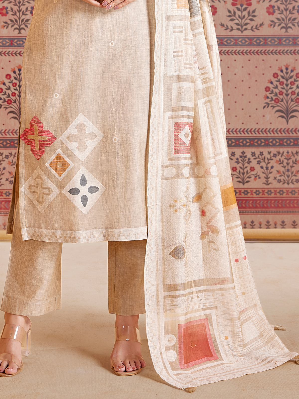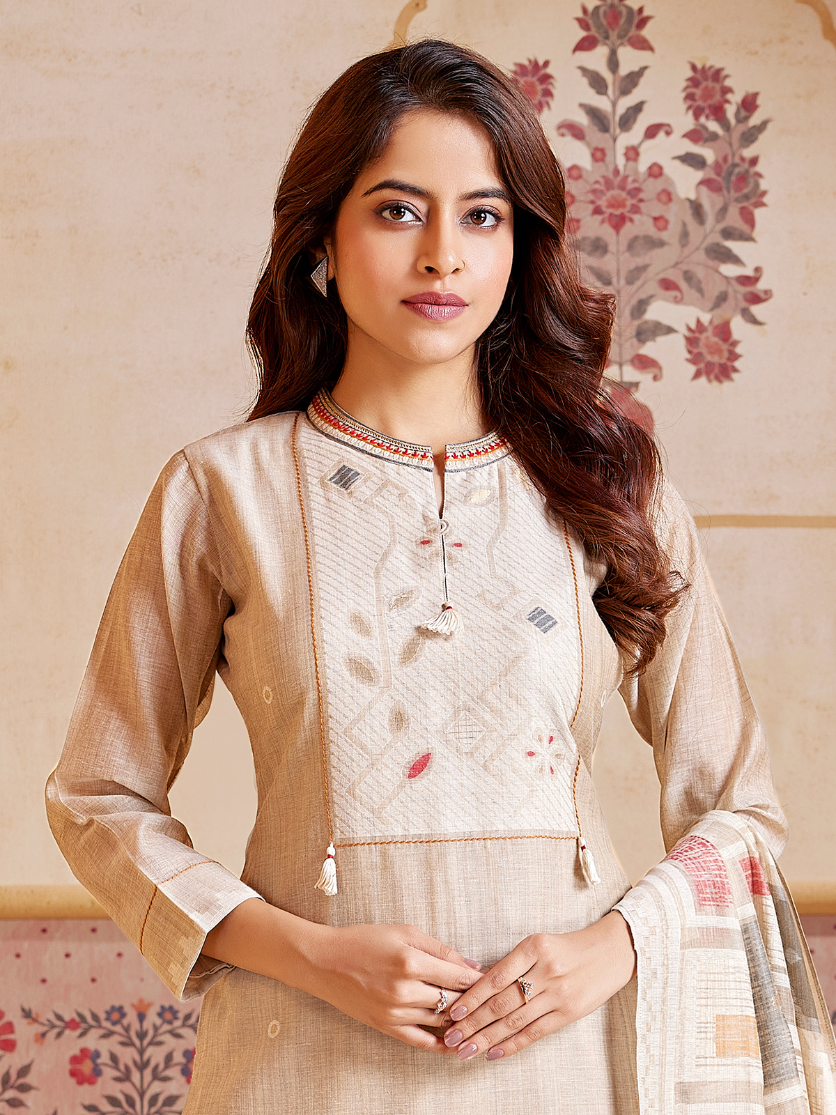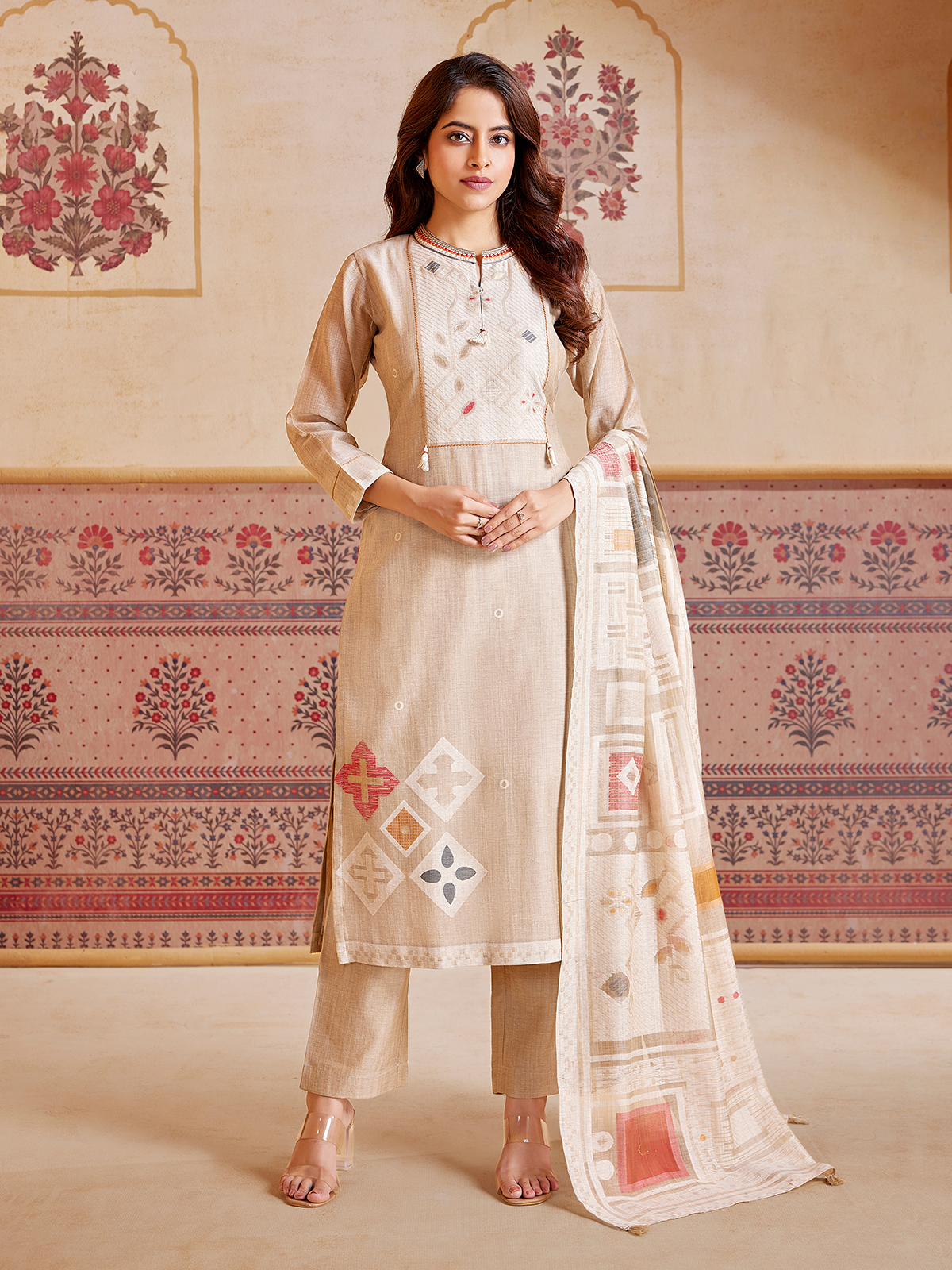 A refined beige cotton silk salwar suit accented with sequins and thread work. Designed with quarter sleeves and pant bottom, it offers a subtle festive glow, ideal for daytime functions, celebrations, or casual gatherings where understated elegance is desired.