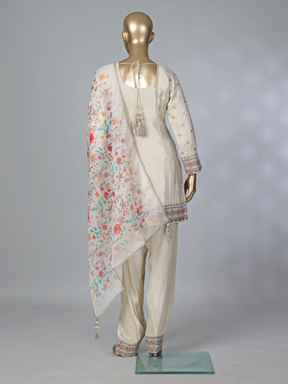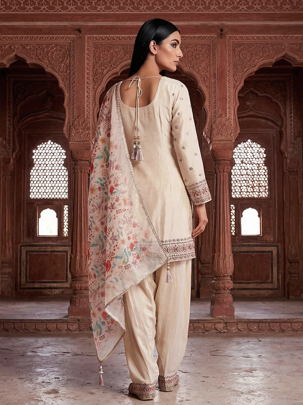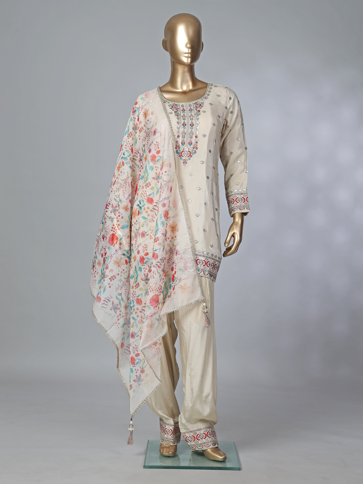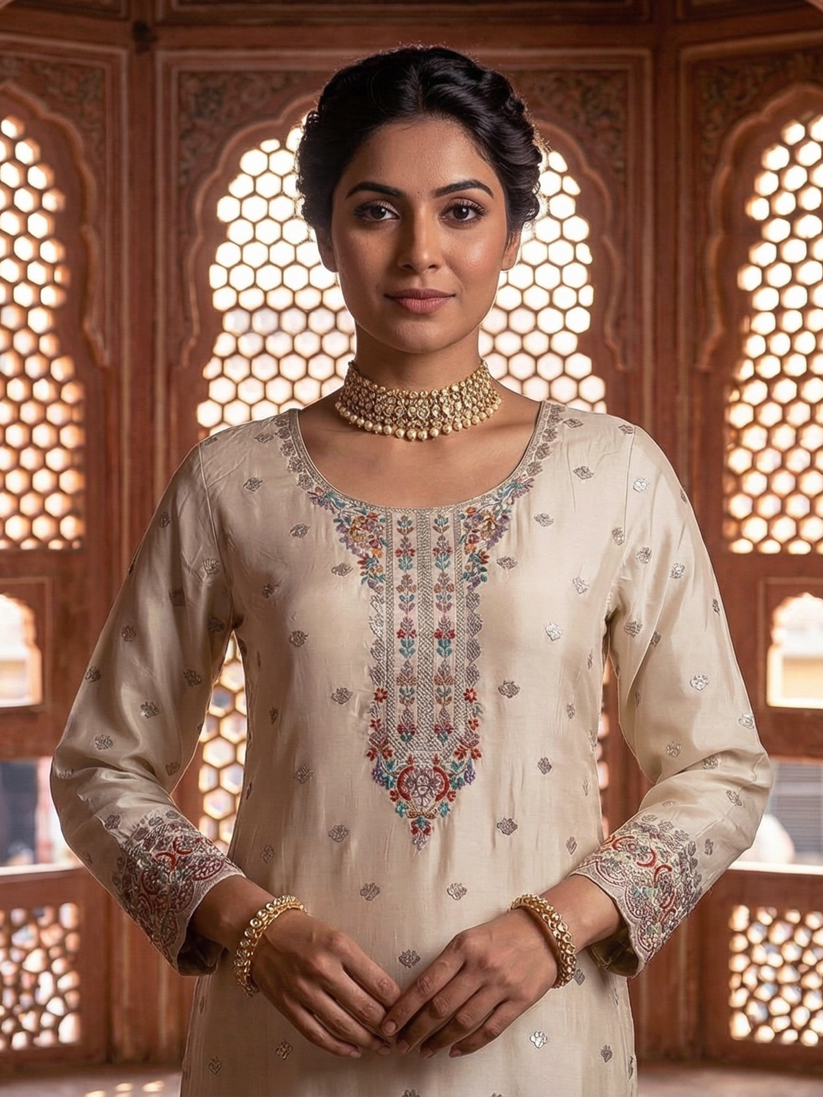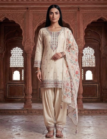 Beige Crepe Silk Punjabi Style Festive Suit With Embroidery
