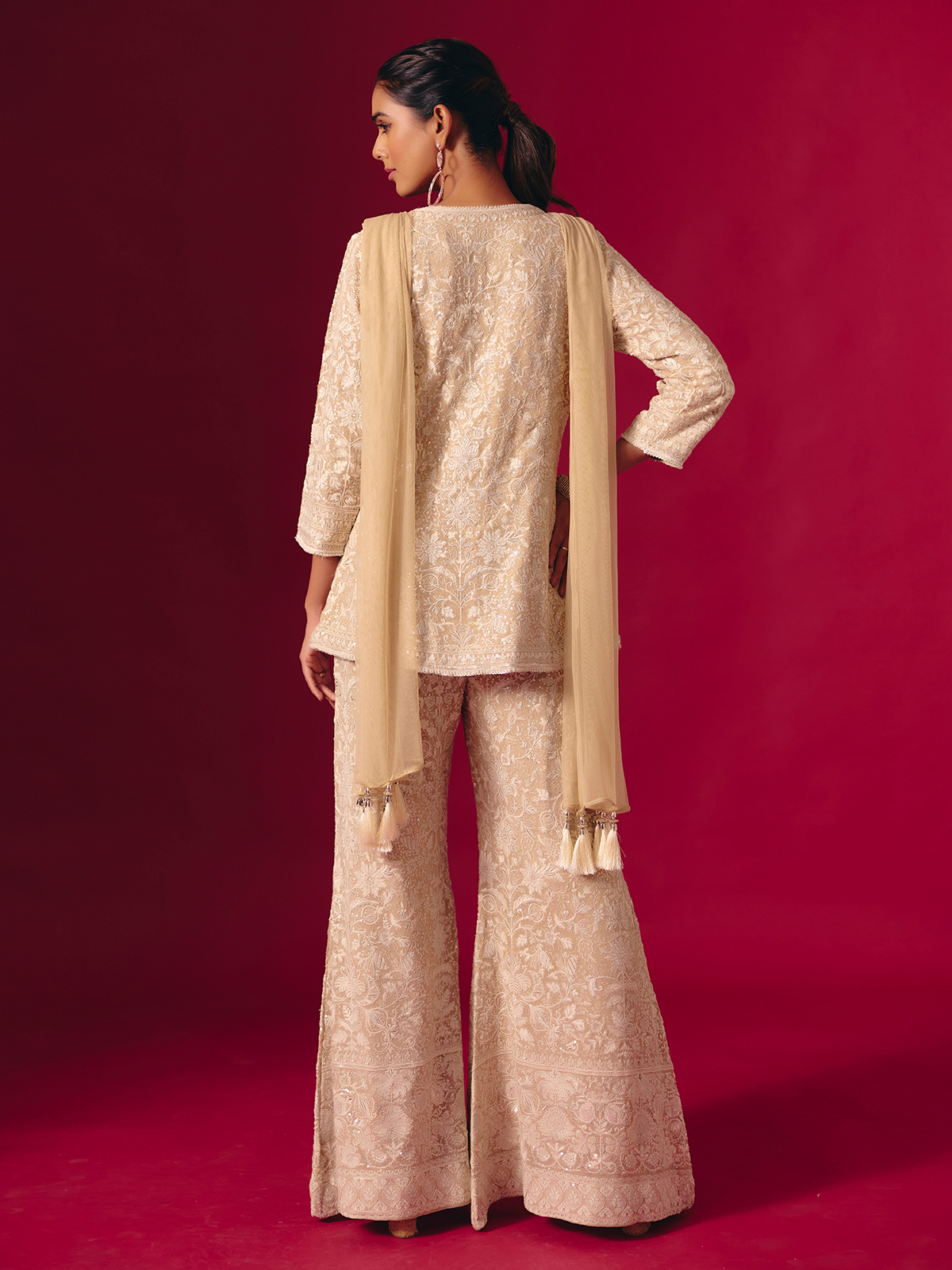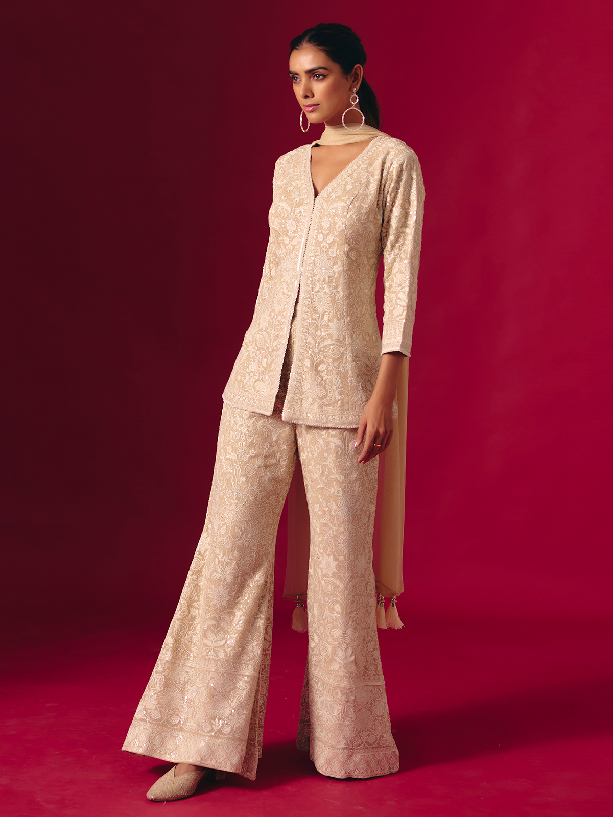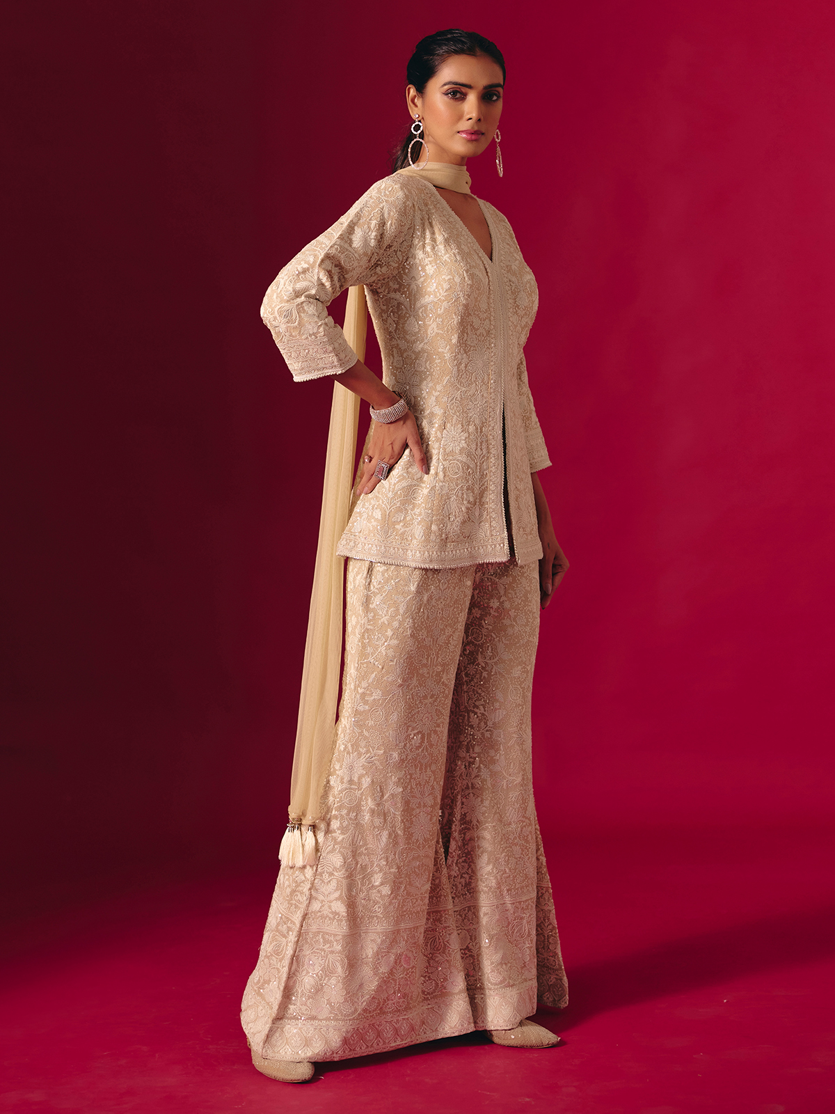 Drape yourself in refined beauty with this beige georgette Pakistani-style suit, enriched with resham embroidery, sequins and pearls. The V-neck and quarter sleeves elevate its elegance, while the dupatta adds a delicate finish—perfect for weddings, sangeet and festive occasions.