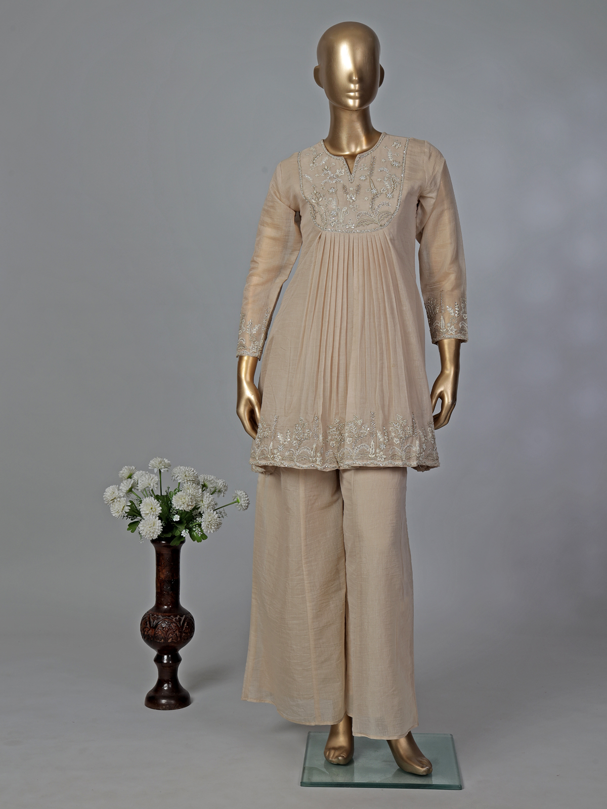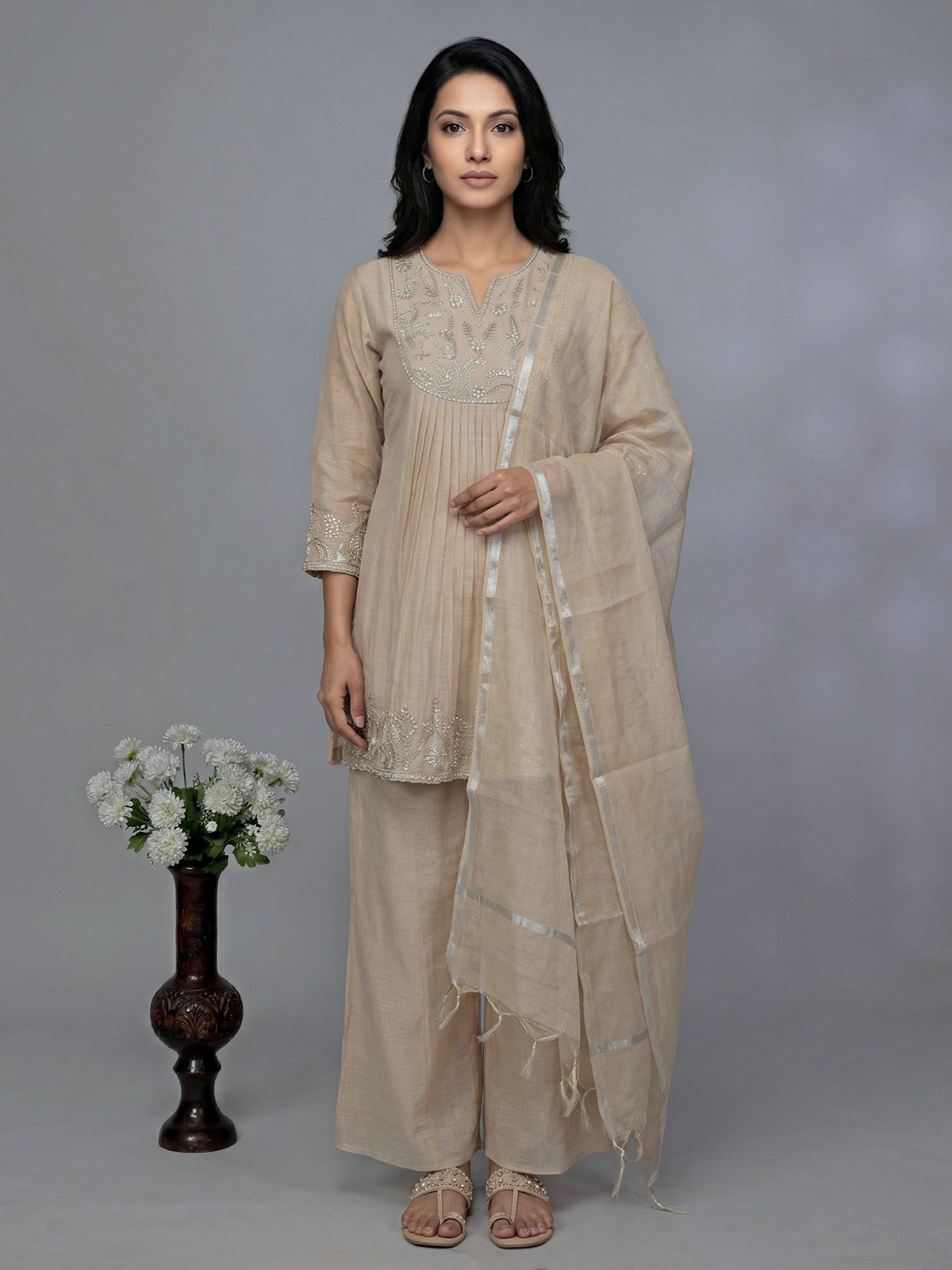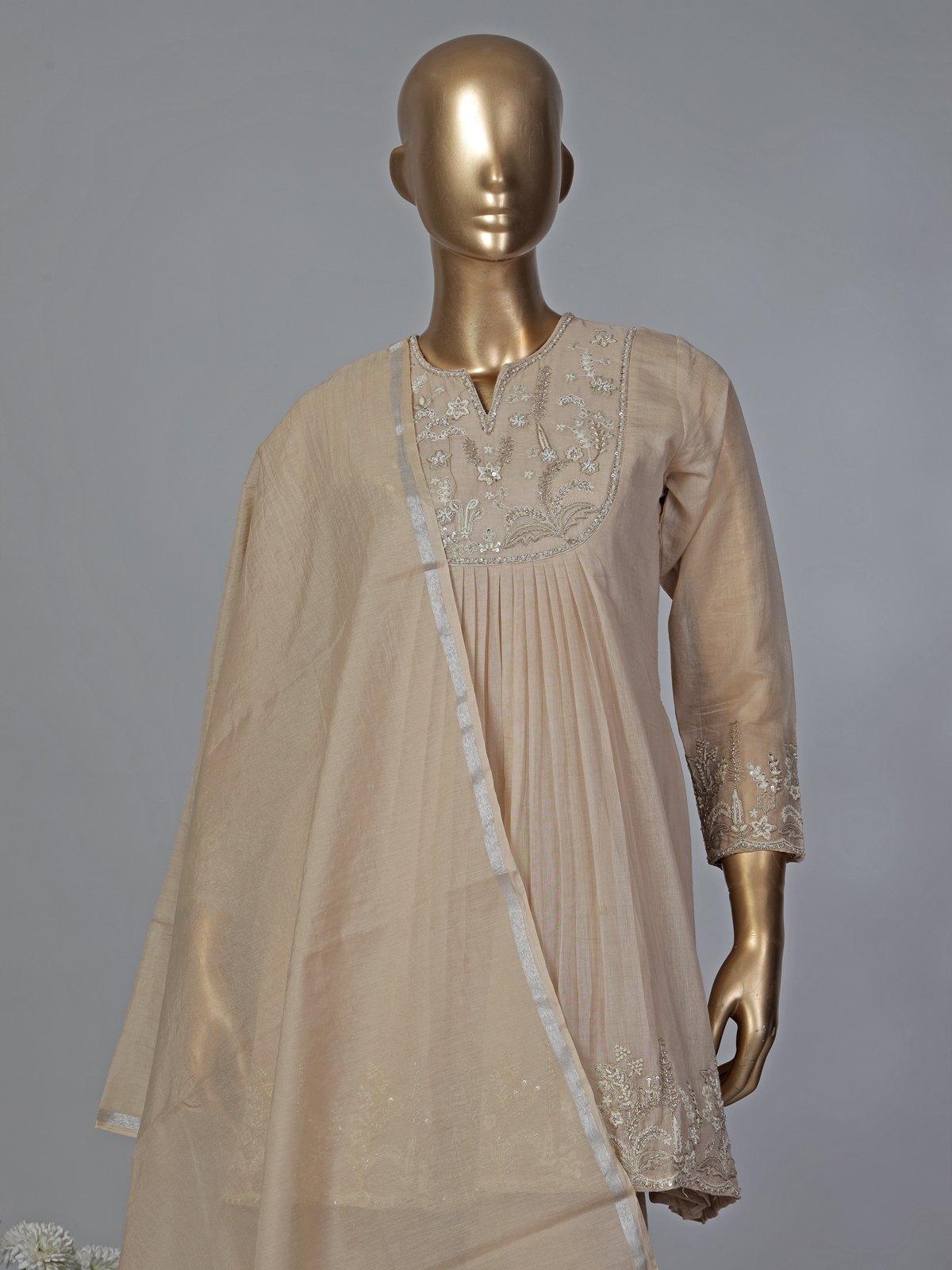 Radiate a subtle, refined beauty that turns heads in this understated beige linen salwar suit. Featuring elegant quarter sleeves, it is heavily detailed with fine thread, sequins, beads, and cutdana work. Perfectly suited for festivals, weddings, and eid, this outfit is completed with comfortable pant and a coordinating dupatta.