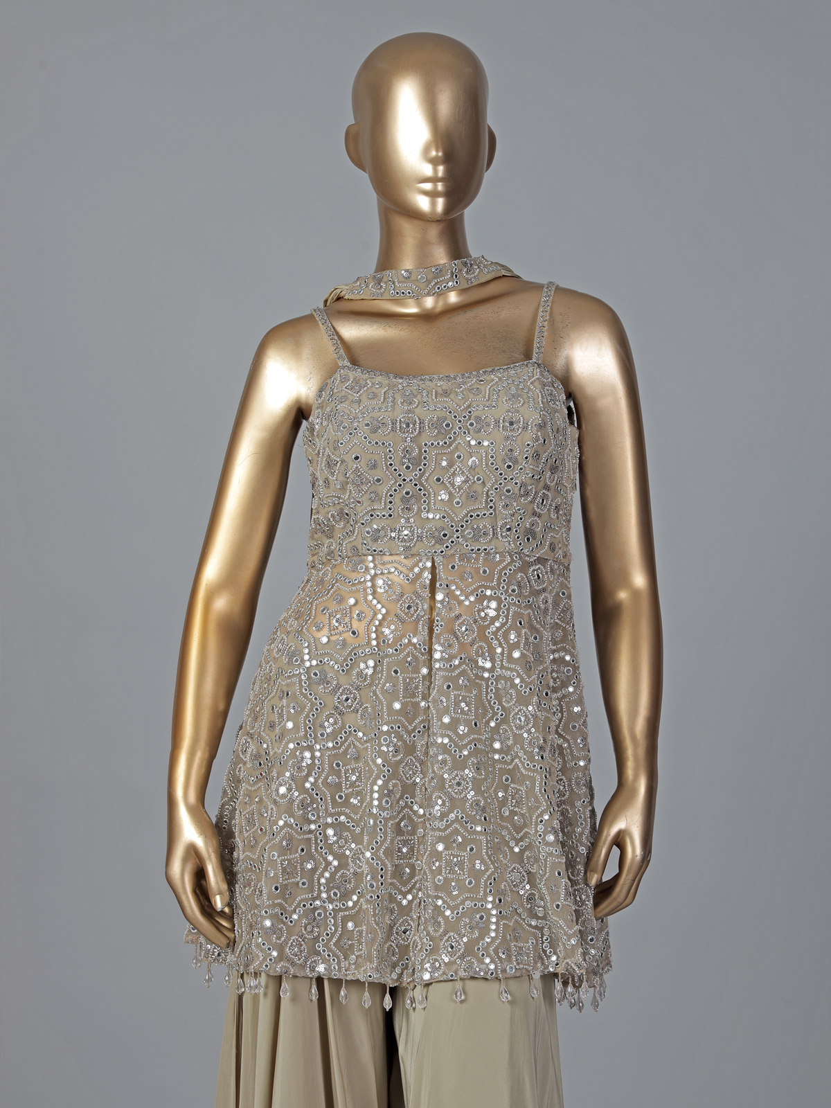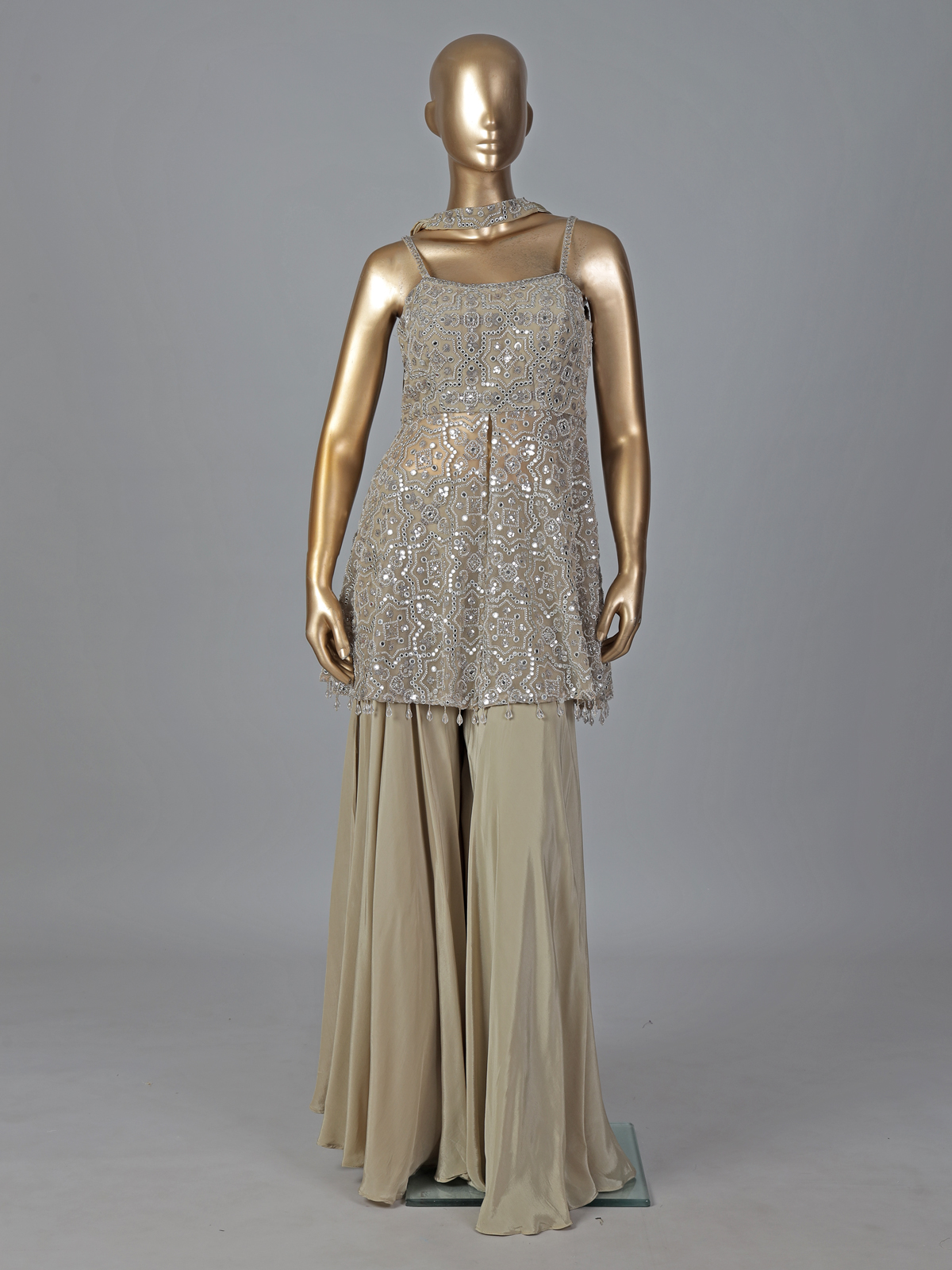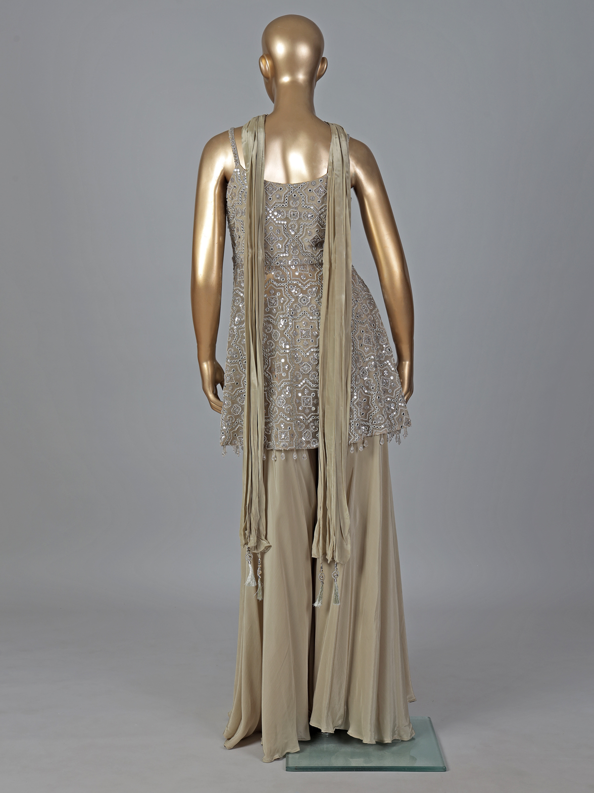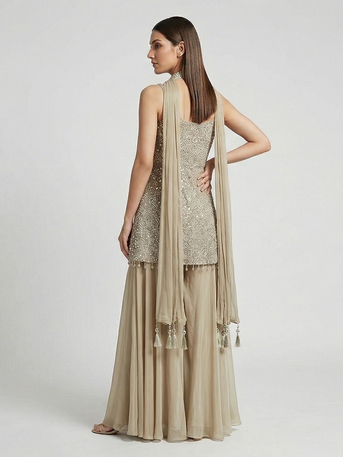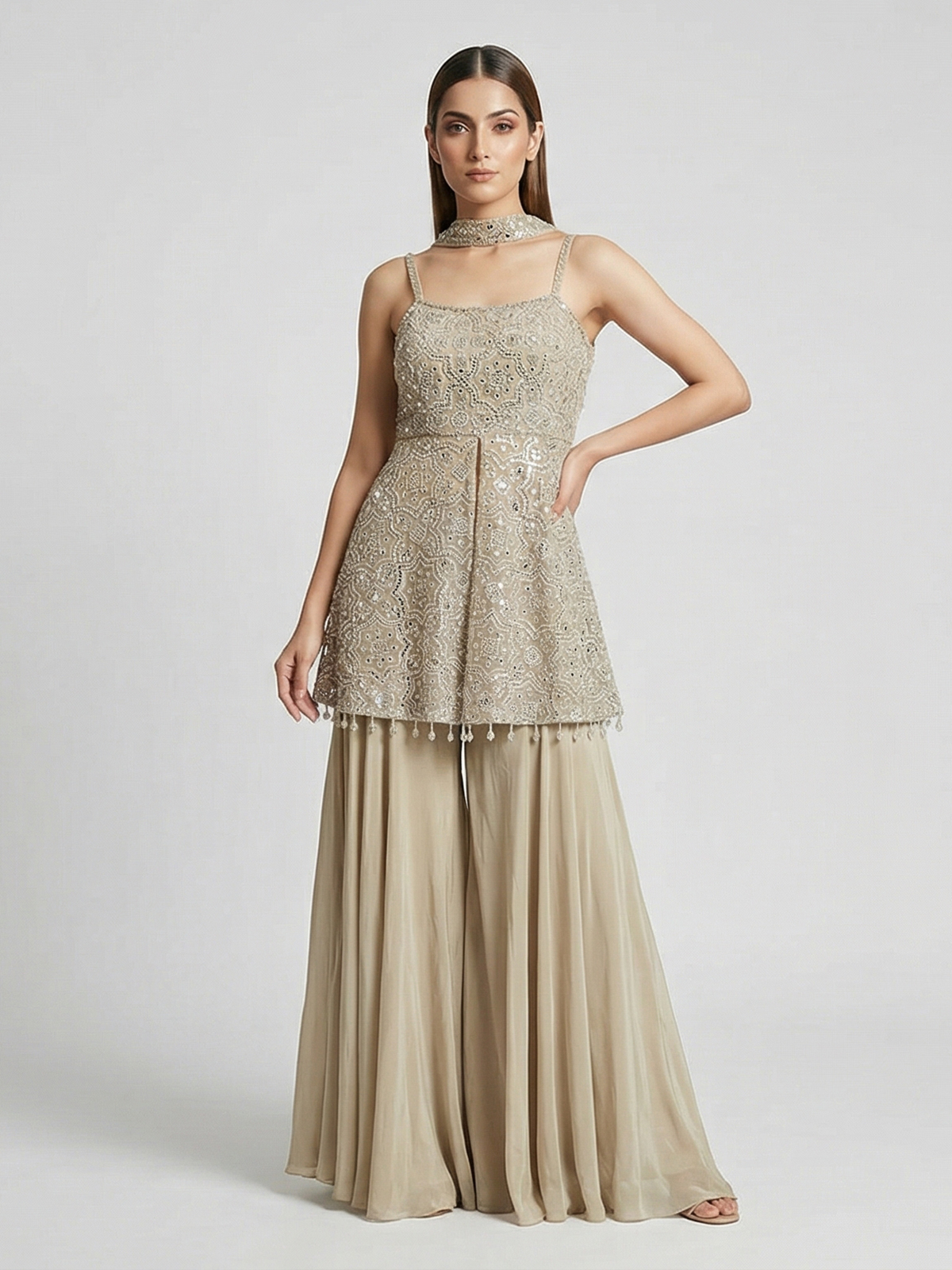 Delicate and feminine, this beige net palazzo suit is embellished with aabla, sequins, beads and cutdana work that add soft sparkle. Styled with a choker dupatta and bottoms, it creates an elegant festive silhouette.
