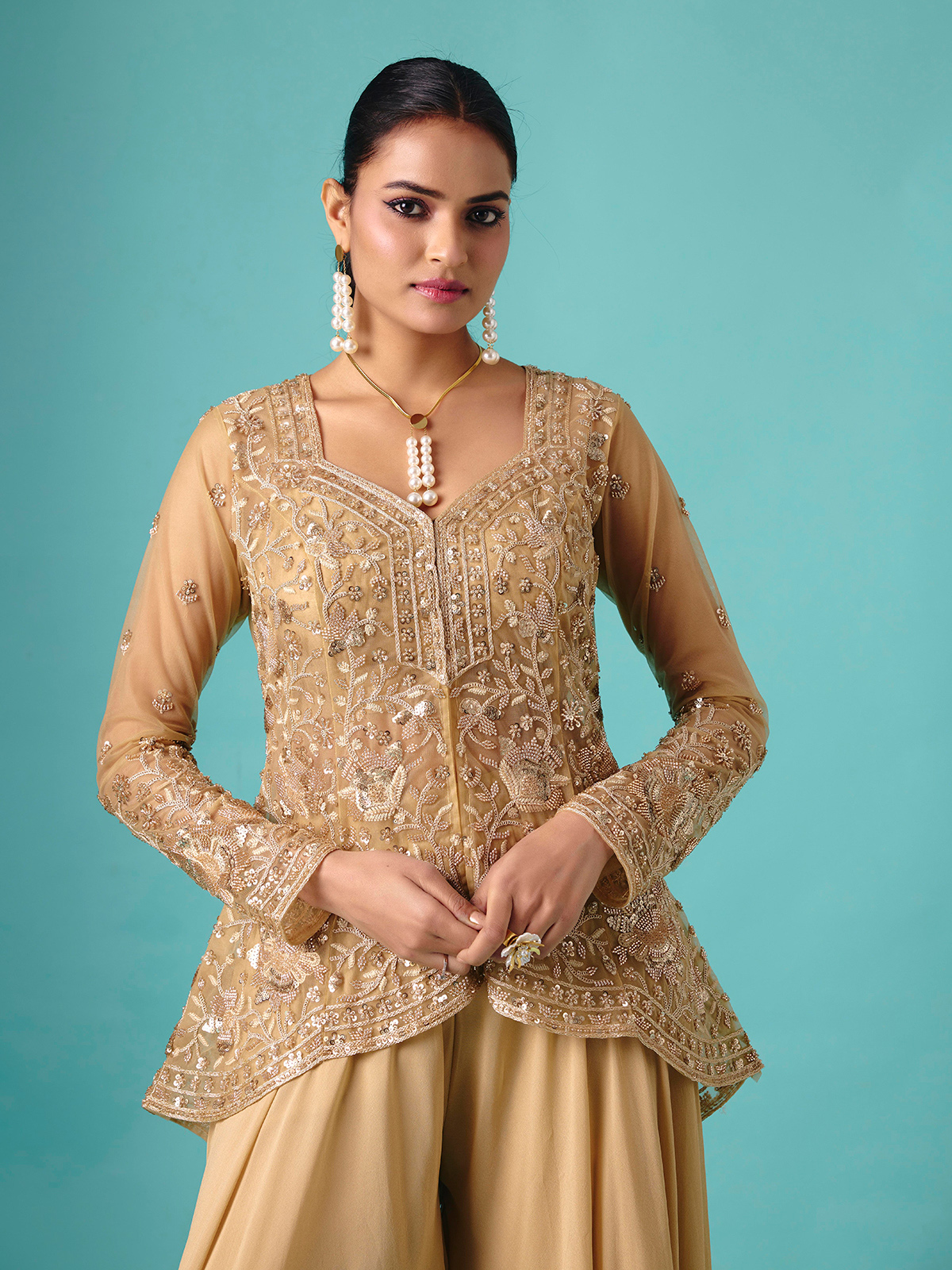 Crafted in beige net and silk, this designer palazzo suit shines with cutdana, zardosi, beads, and sequins embellishments. Sweetheart neckline adds romantic allure, while full sleeves lend elegance. Flowing palazzo bottoms ensure graceful movement, complemented by a coordinating dupatta. This ensemble exudes sophistication, artisanal finesse, and festive charm for wedding, reception, and sangeet occasions.